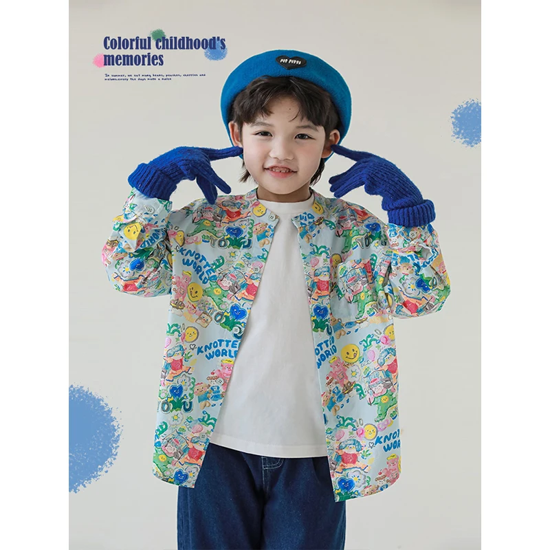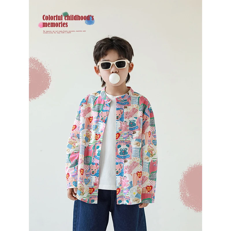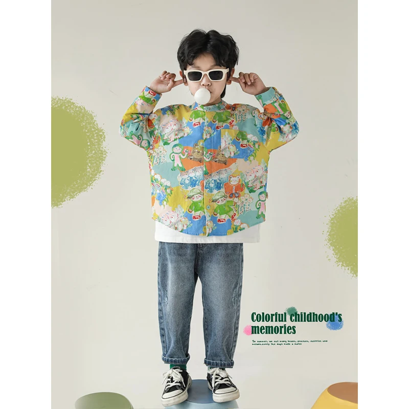Children's Color Digital Printed Artistic Stand Collar Shirt 2023 Autumn New Boys Casual Handsome Shirt