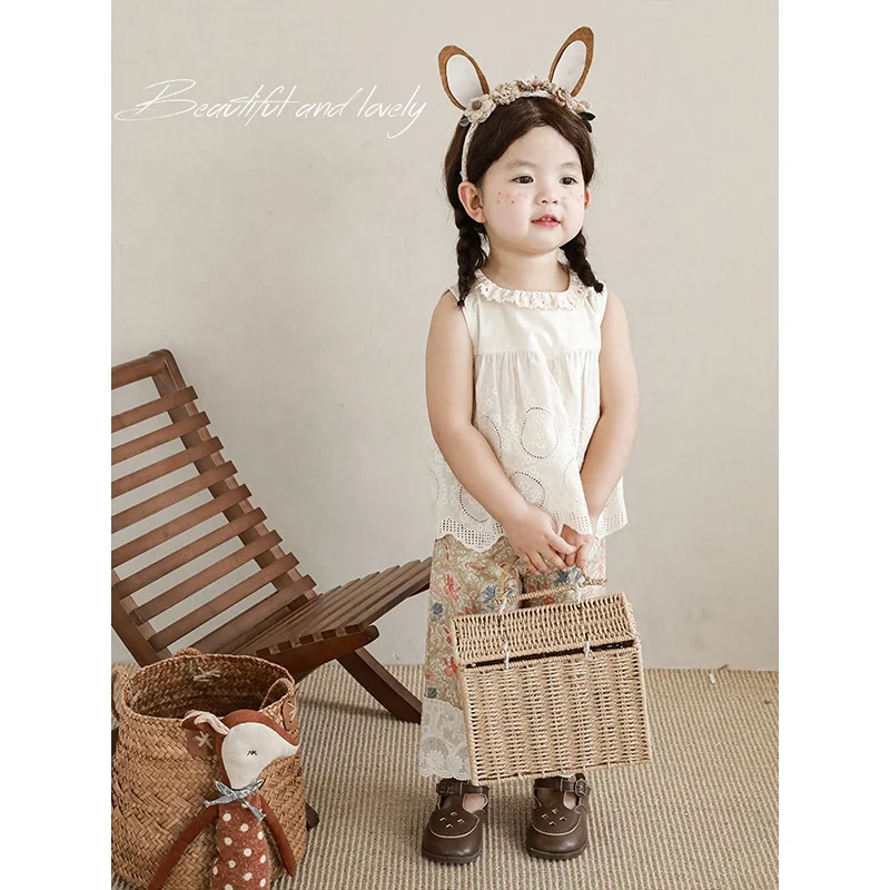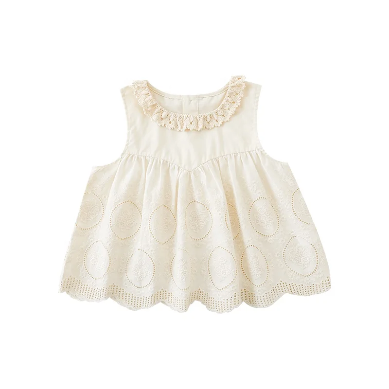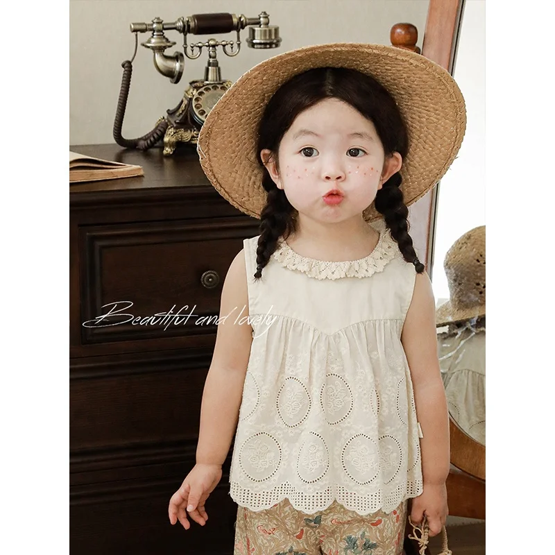 Summer Kids Girls Sleeveless Tank Top Solid Embroidered Floral Lace Cotton Tops Shirt Wholesale All-Match Kids Girls Vest