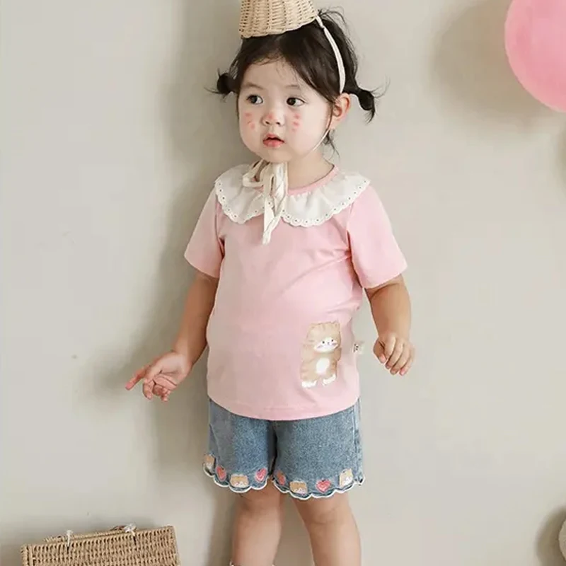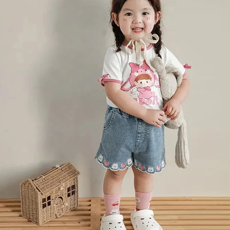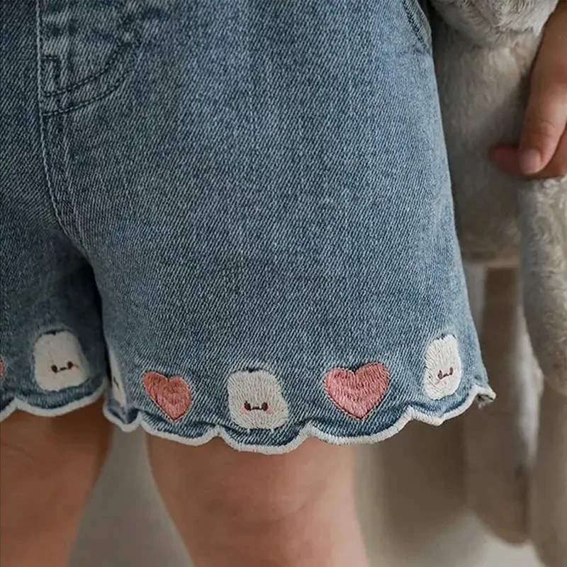 Custom 1-8T Knee Length Cartoon Embroidery Little Kids Denim Shorts Girl Summer Fashion Blue Baby Toddler Girls Shorts
