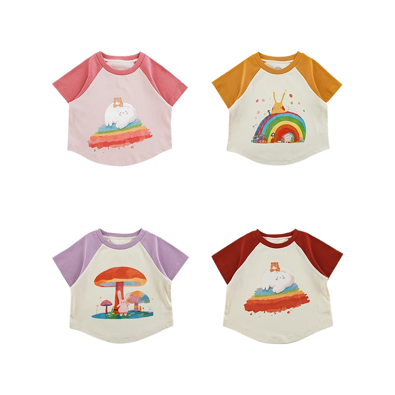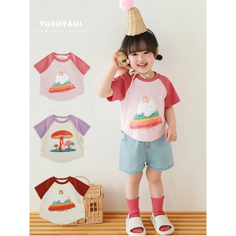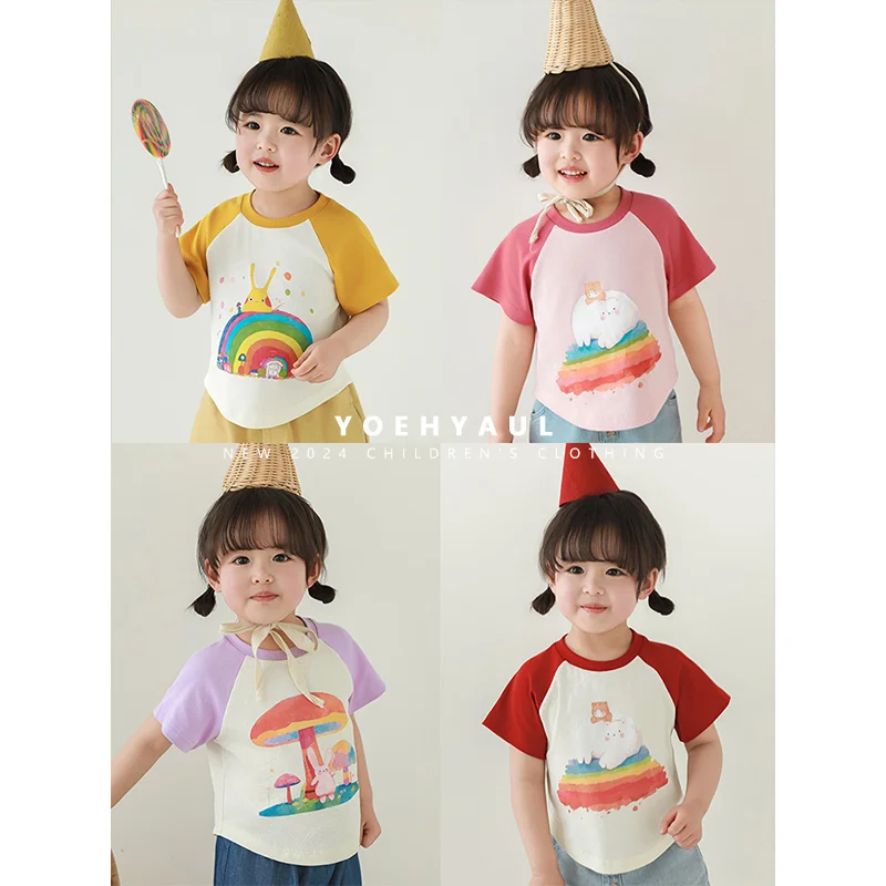 YOEHYAUL 2026 Summer Newest Girls Cartoon Printed Short-Sleeved T-shirt Cute Thin Breathable, Slim-Fitting Short T-shirt LX0180