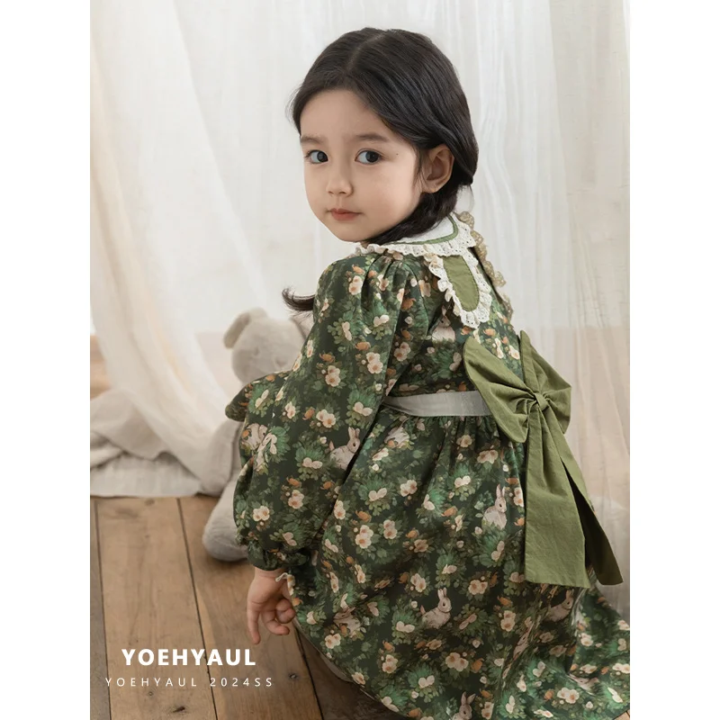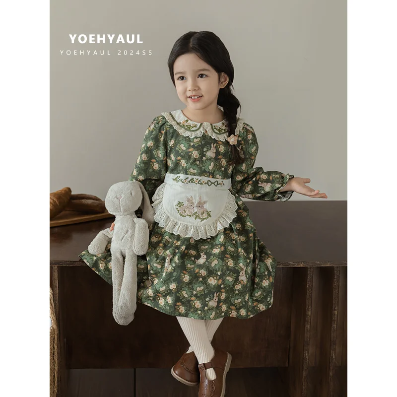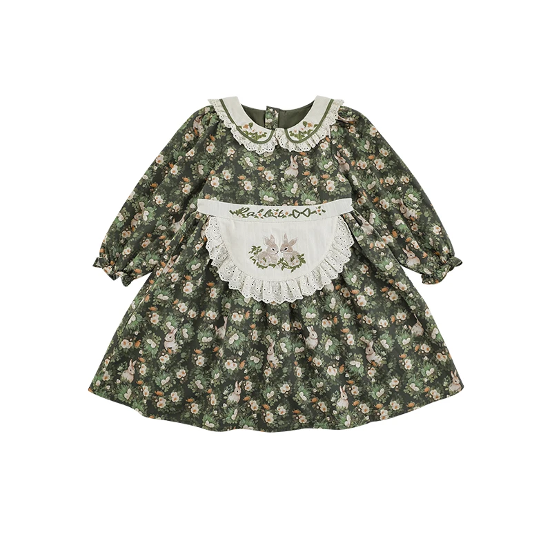 YOEHYAUL Q3608 Autumn Long Sleeve 100% Cotton Green Girl Dresses for 7Year Old Embroidery Bunny Girl Floral Dress Cute for Girl