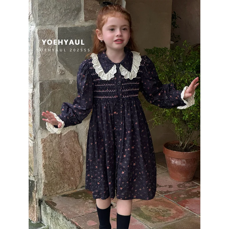 YOEHYAUL 25156 Autumn Long-sleeved Children's Clothing 100% Cotton Floral Country-style Dress Lace Trim Collar Cuffs Girls Dress