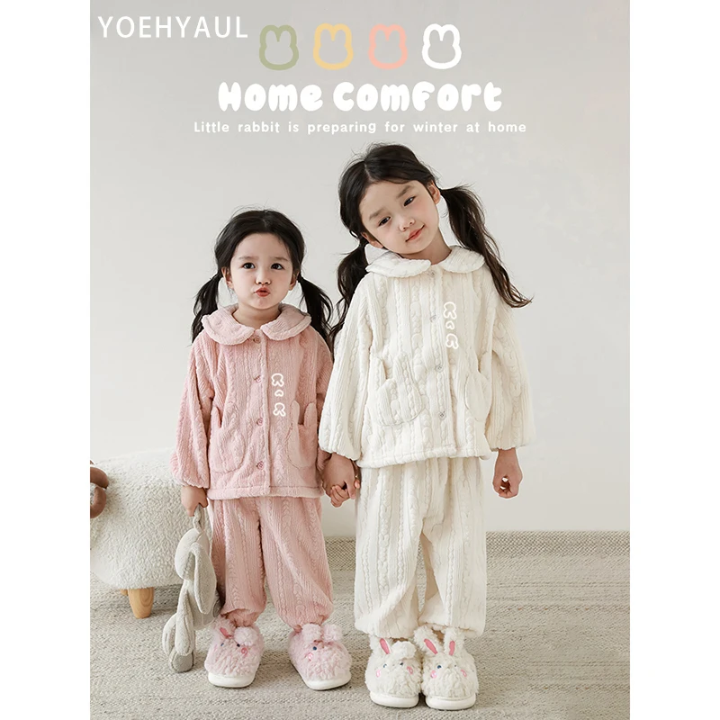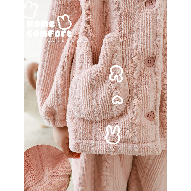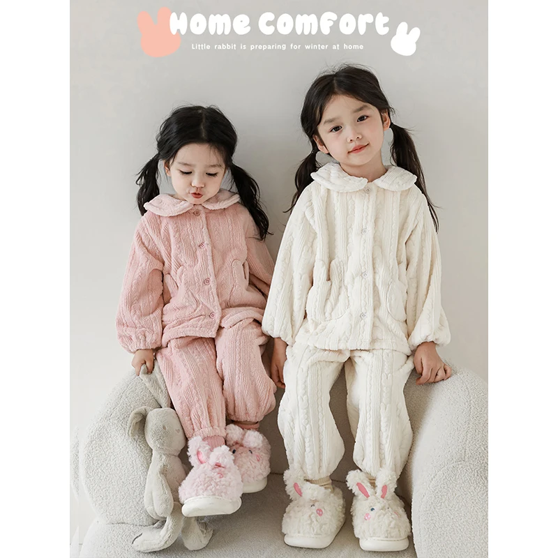 2023 New Arrival Children Girls Long-Eared Rabbit Home Clothes Set Winter Children's Windproof Warm Pajamas Two-piece Set