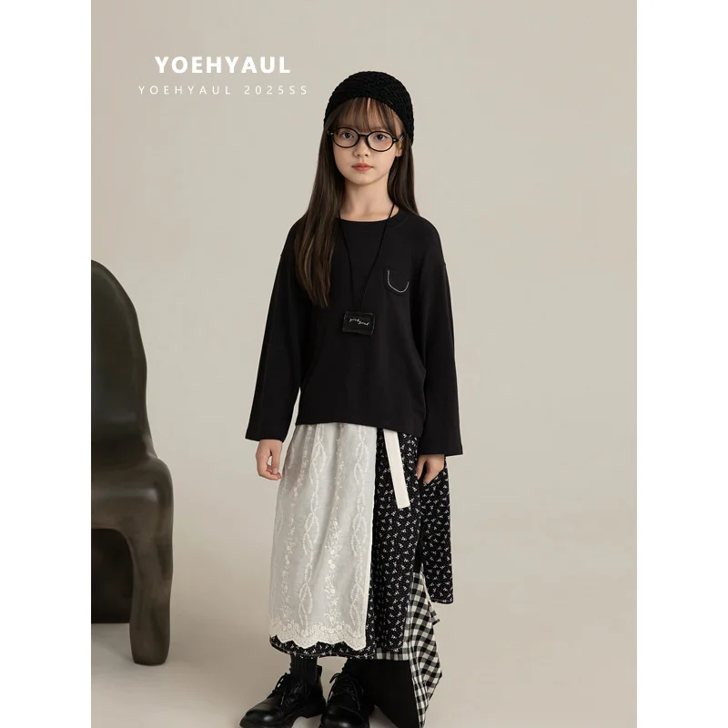 YOEHYAUL CD2263 4-15Y Girl Long-sleeved T-shirt Tops Girls Crew Neck Loose Underwear Anti-pilling Pullover Teen T-shirt
