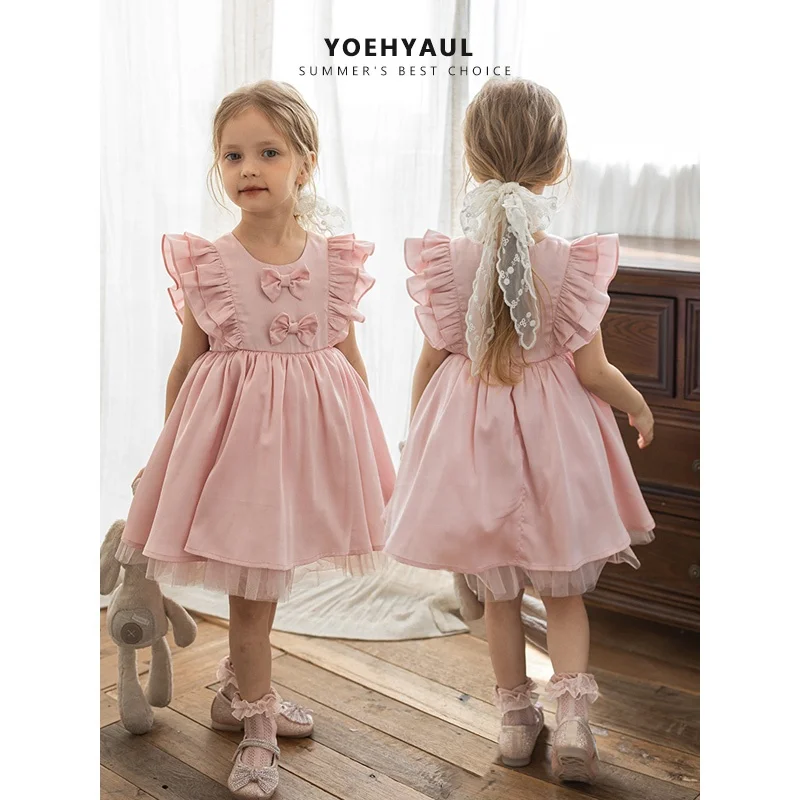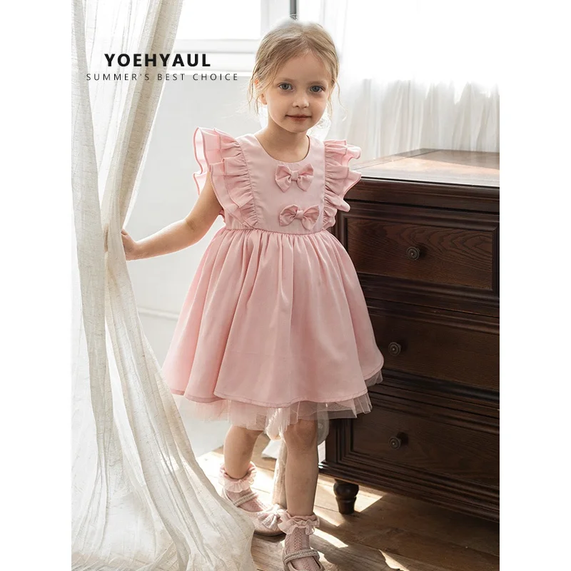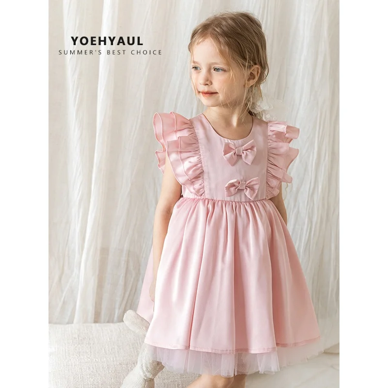 YOEHYAUL X4391 Toddler Princess Evening Dresses for Children Wholesale Pink Luxury Flower Little Girls Kids Satin Dress with Bow