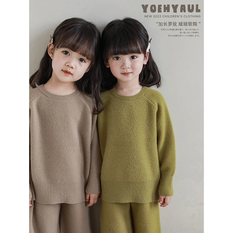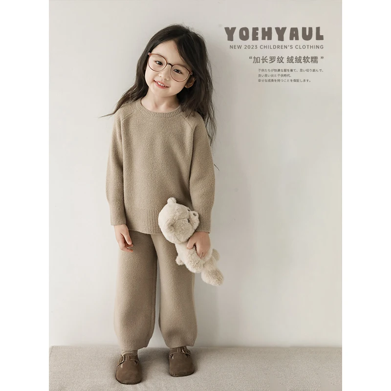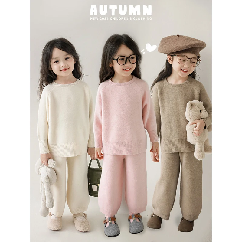 2023 Autumn Girls Loose Casual Suit Autumn Children's Cute Full Tendon Waist Lazy Style Sweater Two-Piece Set
