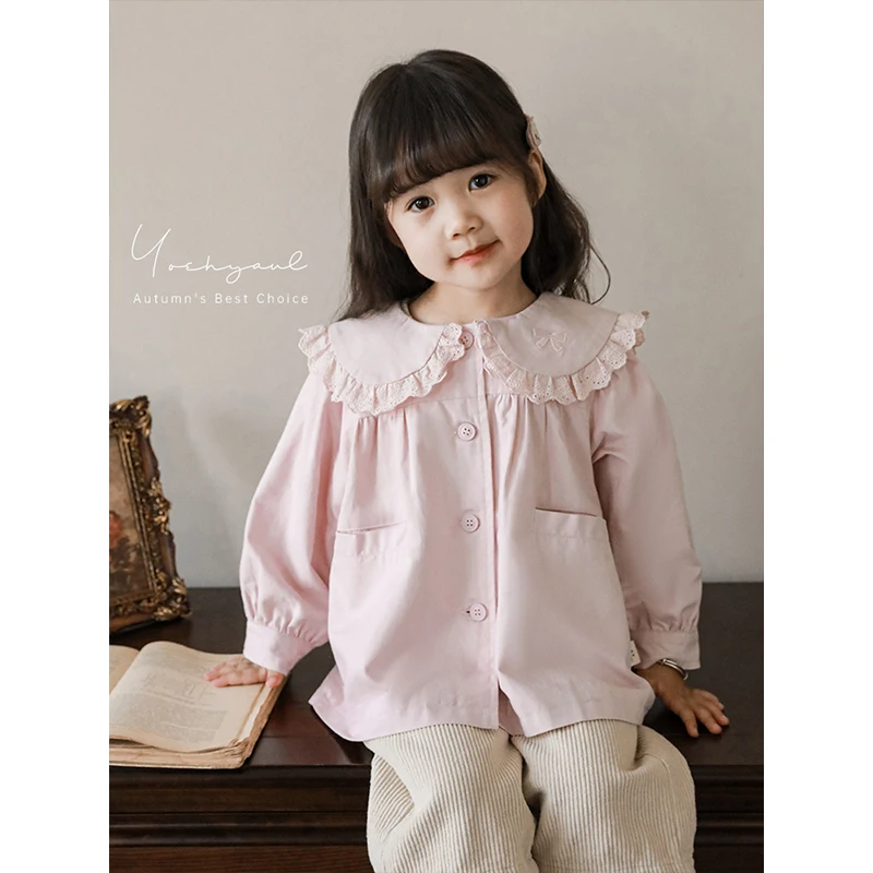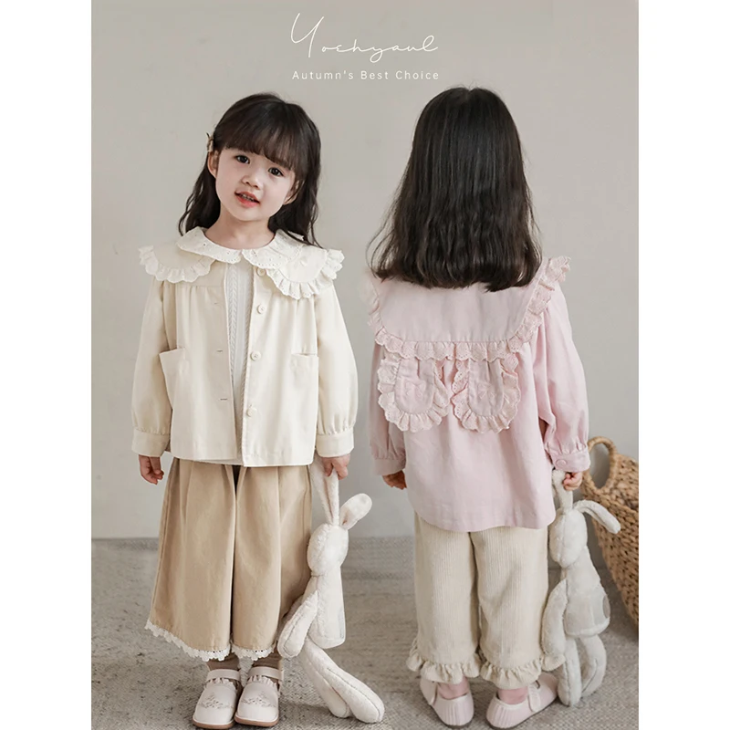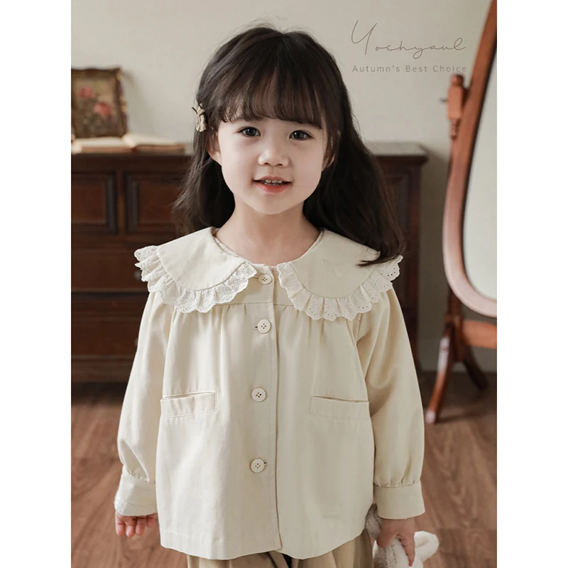 YOEHYAUL Girls' Lace Ruffled Lapel Windbreaker Autumn Children's Cute Three-Dimensional Long-Eared Rabbit Loose Coat
