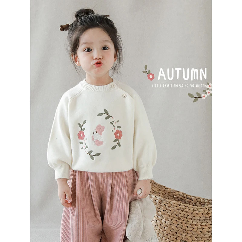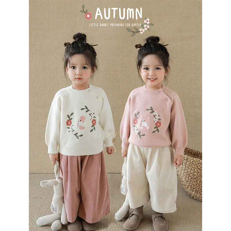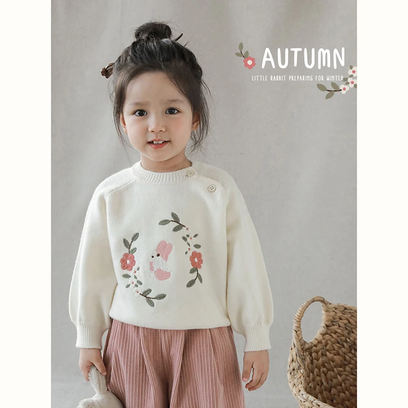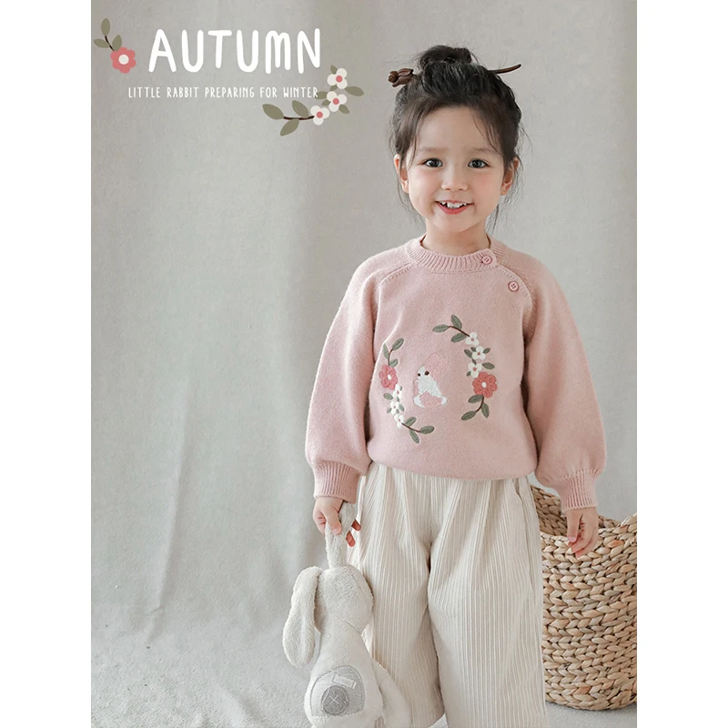 Girls Single-Sided Embroidered Sweater Autumn Children's Fashion Cute Ribbed Edge Windproof Warm Raglan Top