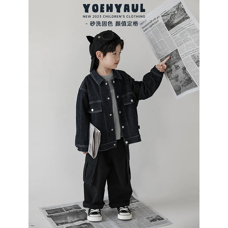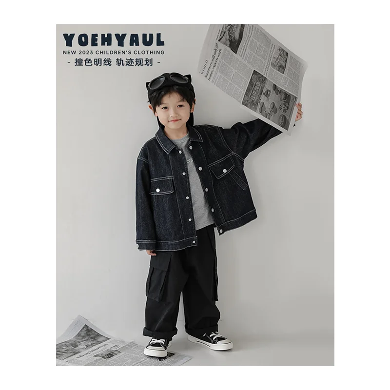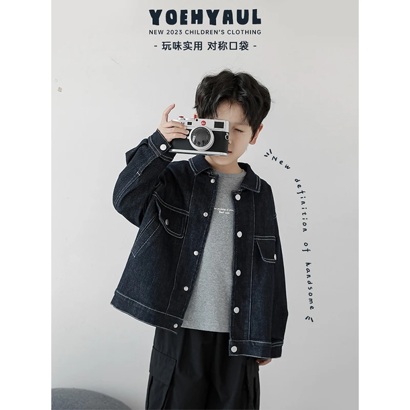 Boys' Four-Way Open Button Three-Dimensional Patch Pocket Denim Jacket Autumn New Style Children's Handsome Casual Top