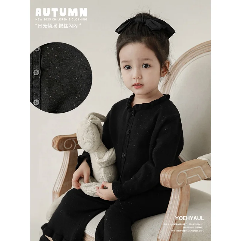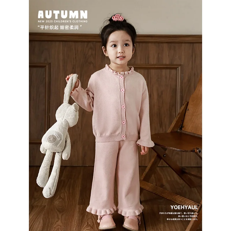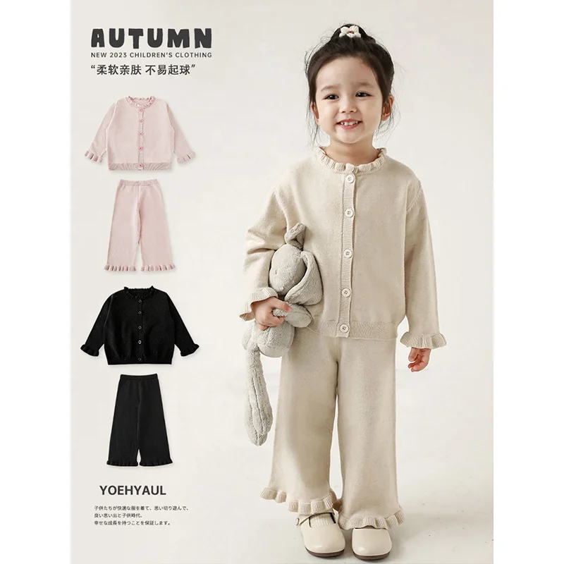 YOEHYAUL Q2740 Autumn New Arrival Knitted Pink Black Beige Baby Girls Knitwear Pants Wholesale Kids Girls Cardigan Sweater Set