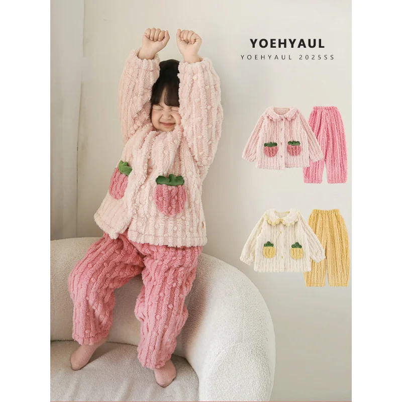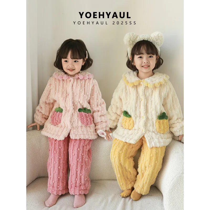 YOEHYAUL D4058 2 Pieces Warm Toddler Nightwear for Kids Girls 1-7yrs Thick Kids Fleece Winter Pajama Set for Kids