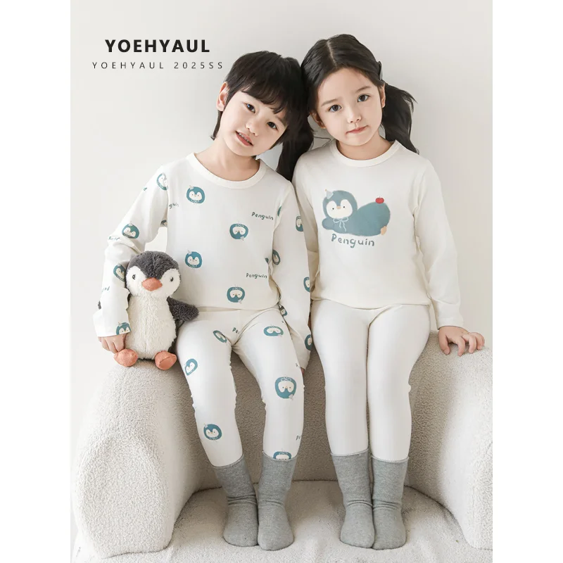 YOEHYAUL GN6937 N7001 Autumn Cute Penguin Panda Print Boys Children Pajamas Set Soft Breathable Long Sleeve Pajamas for Children