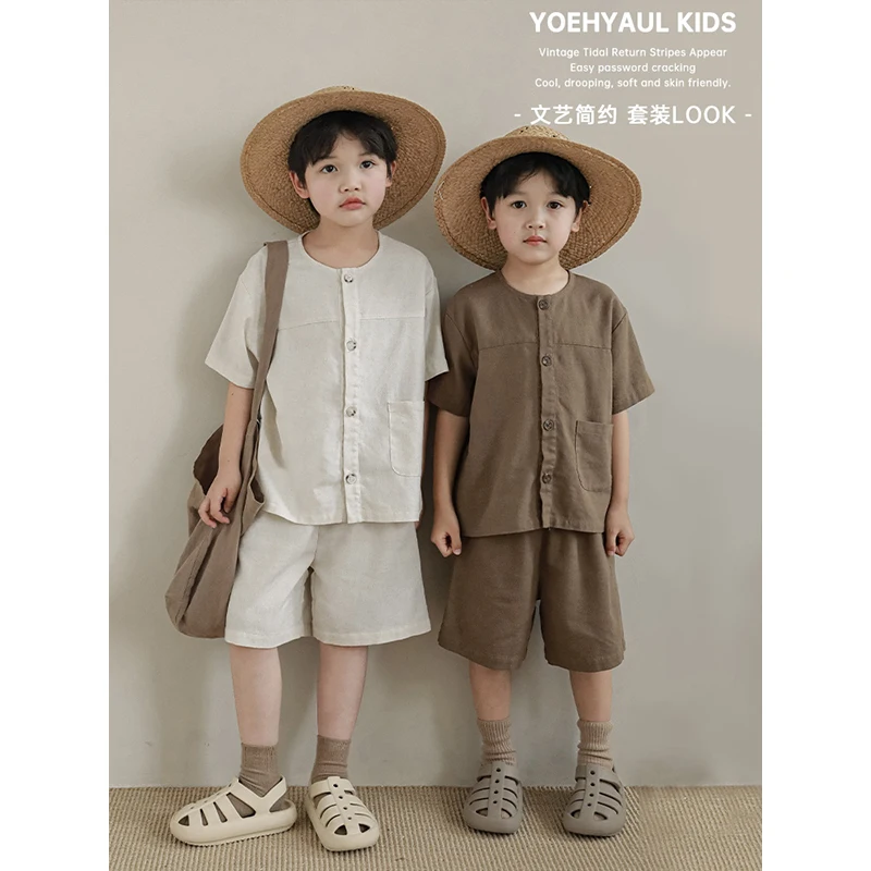 YOEHYAUL N3720 Custom 2 Pieces Loose Solid Toddler Boy Summer Set Child Plain Kids Linen T Shirt Shorts Set