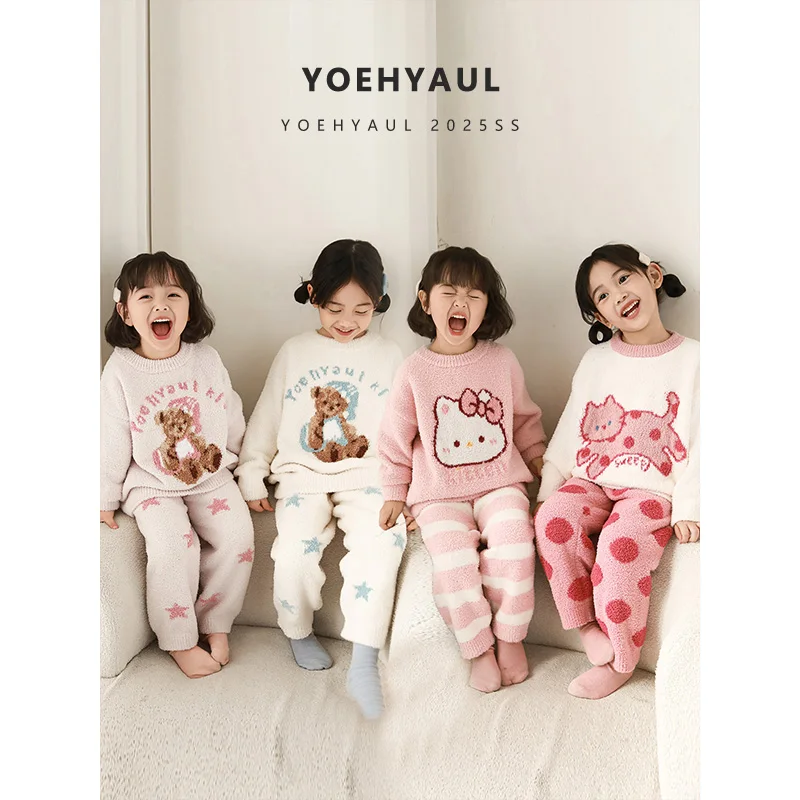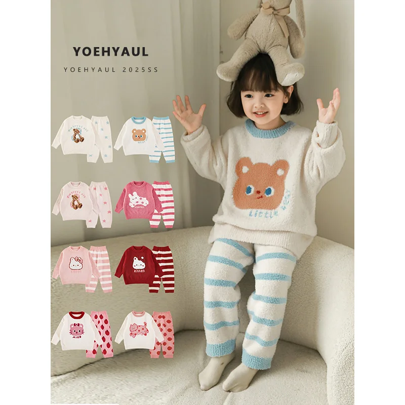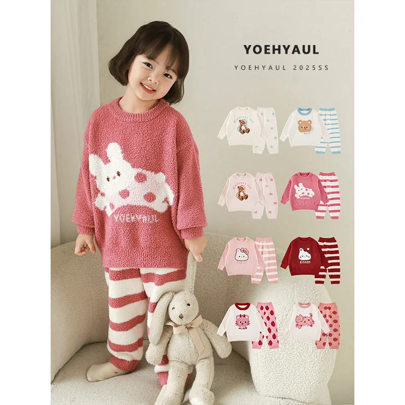 YOEHYAUL D4413 2 Pieces Warm Baby Girl Pajamas Winter Toddler Child Fleece Pajamas Home Wear for Kids