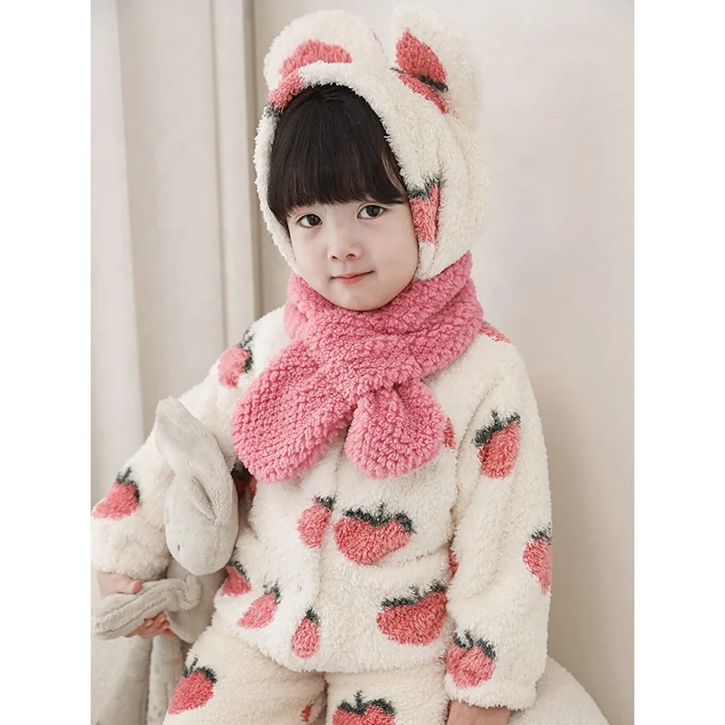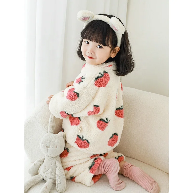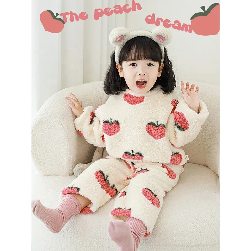 High Quality Child Fluffy Fleece Winter Pajamas for Baby Girls Cute Fruit Peach Warm Night Wear Sleepwear Kids Pyjamas Set