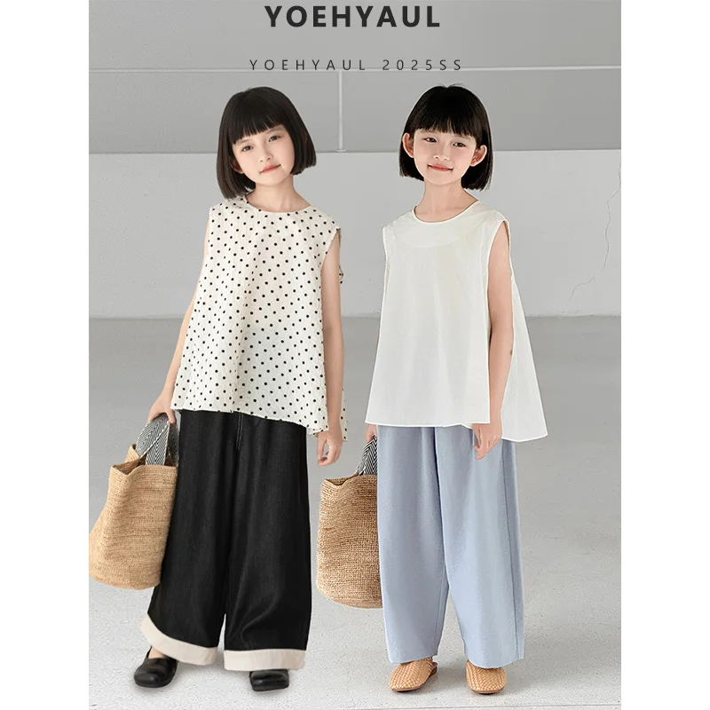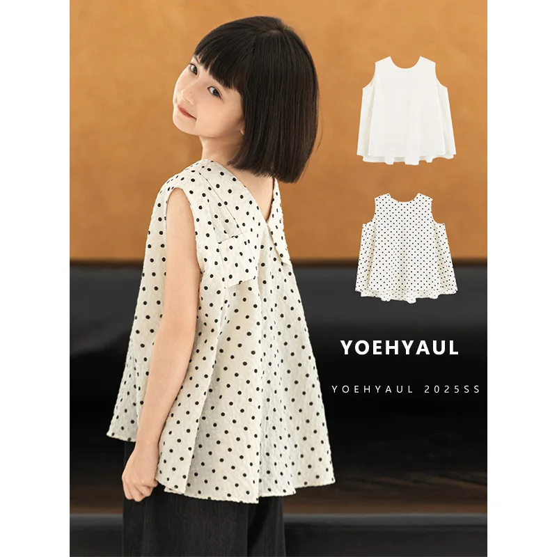 YOEHYAUL CD1577 Summer High Quality Big Girls Sleeveless Top Solid Color Polka Dot Wave Hem Teen Elegant Doll Shirt for Girls