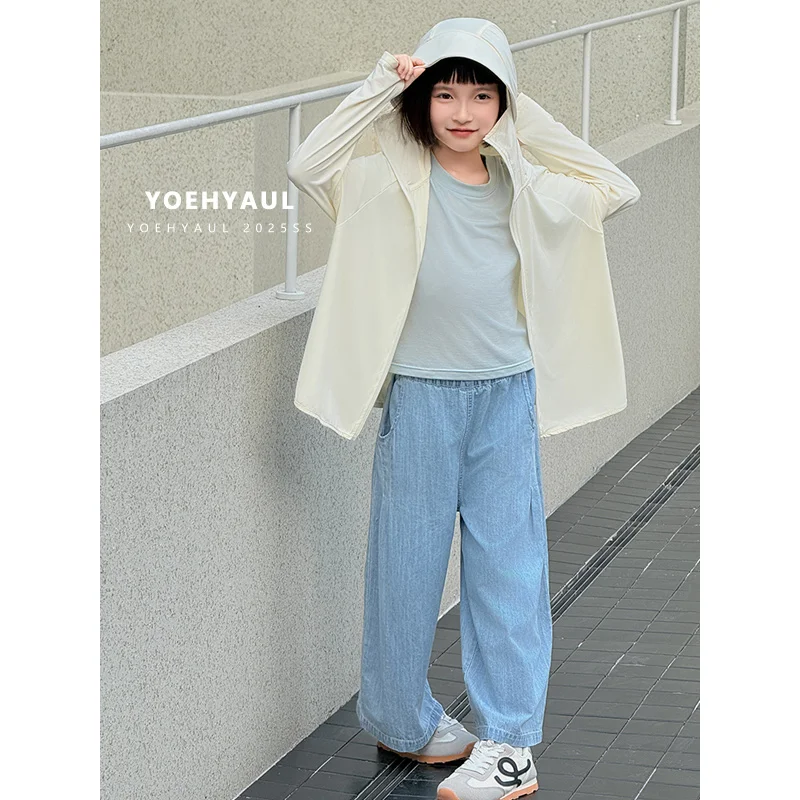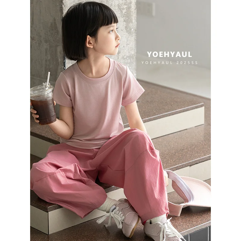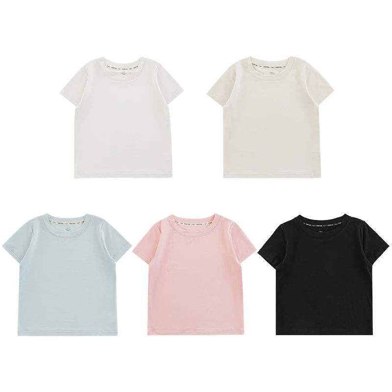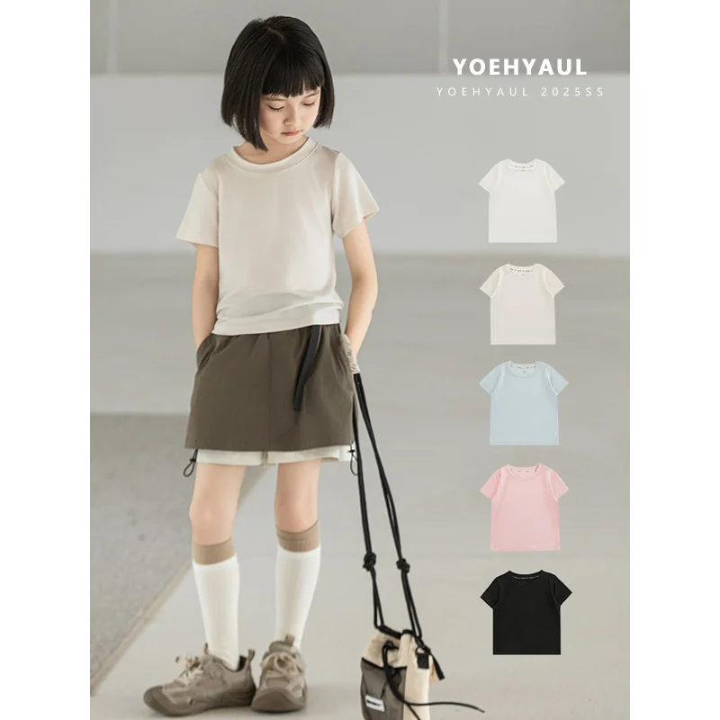 YOEHYAUL CD1662 Big Girls Simple Knit Fabric T-Shirt Top Summer Lycelle Solid Color Crew Neck Knit T-Shirt Short Sleeve for Kids