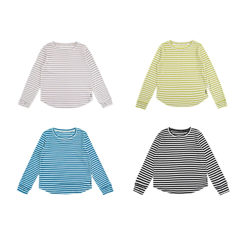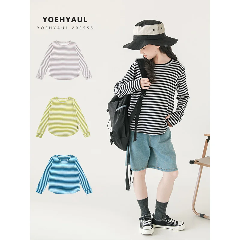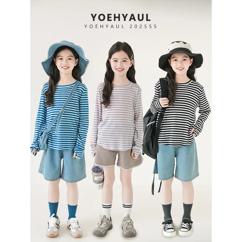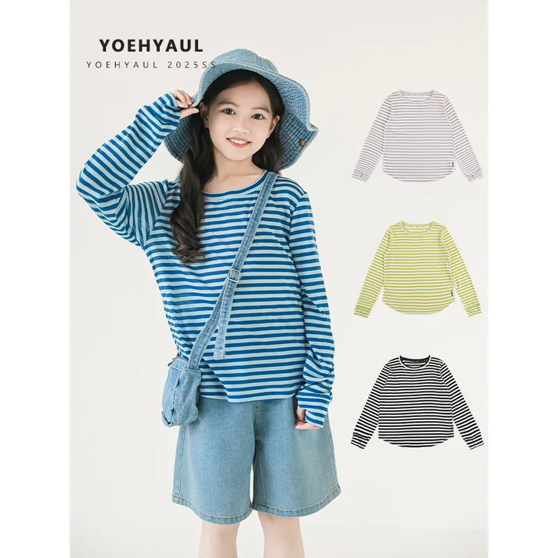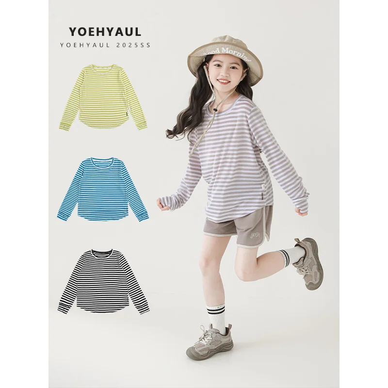 YOEHYAUL CD1429 4-16Y Big Girl Kids Long Sleeve T-shirt Teenager Striped Anti-UV Summer Children's Thin Shirts Teen Shirt