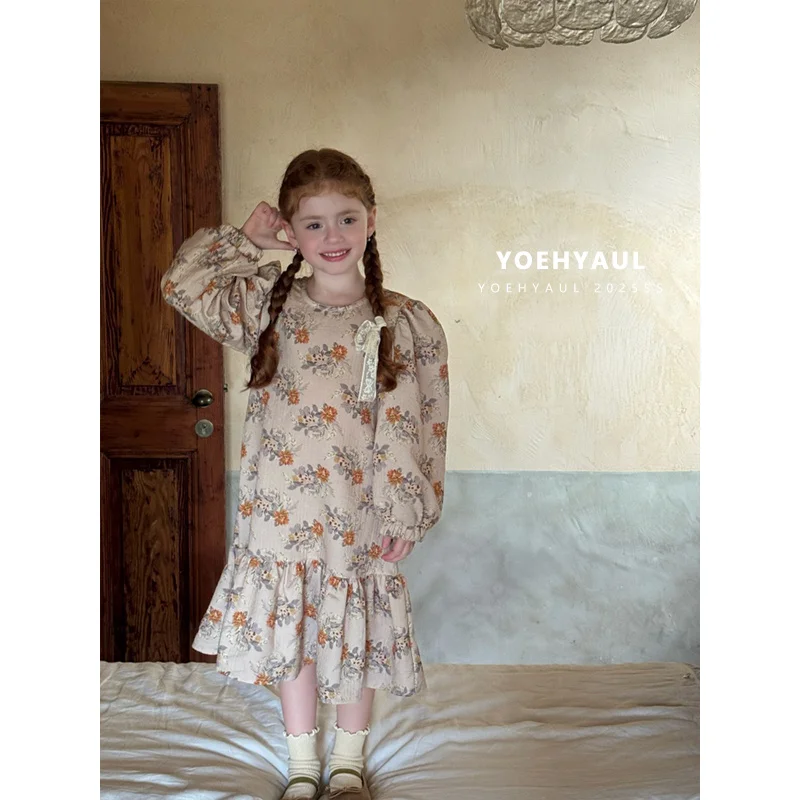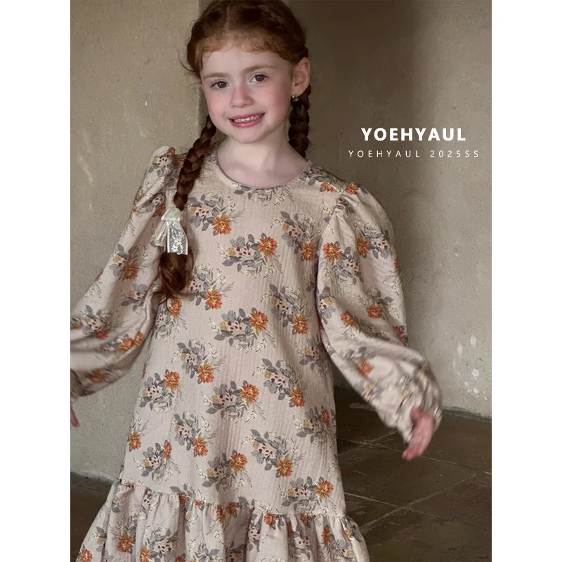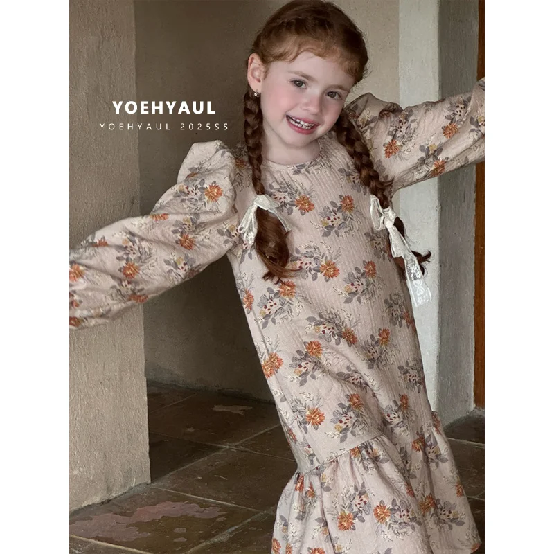 YOEHYAUL 25160 100% Cotton Floral Print Long Dress Kids Puff Sleeves Autumn Long-sleeved Fishtail Patchwork Dress Girls Dress