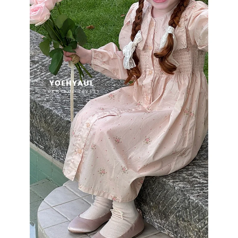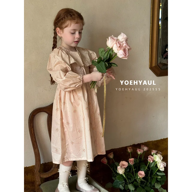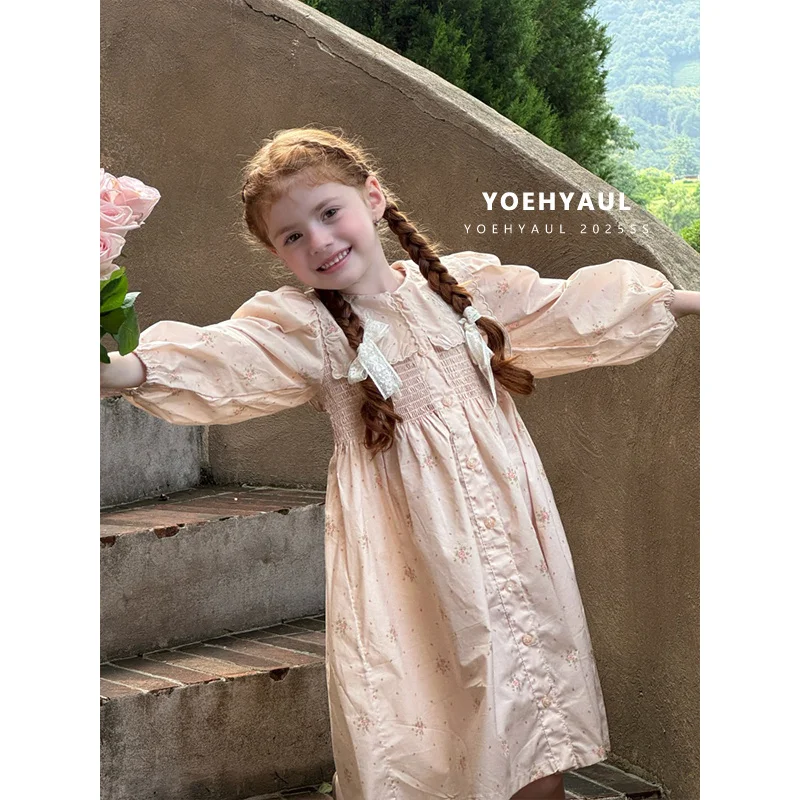YOEHYAUL 25163 100% Cotton Children's Dress Girl Flower Dress Long Sleeve Children's Smocked Dresses Elegant for Baby Girl