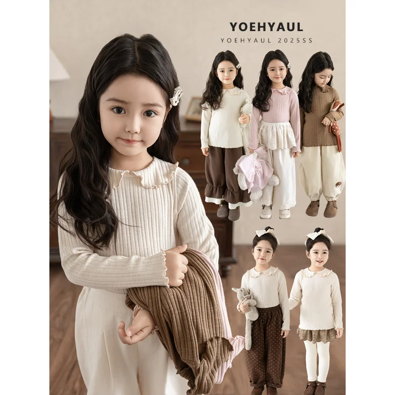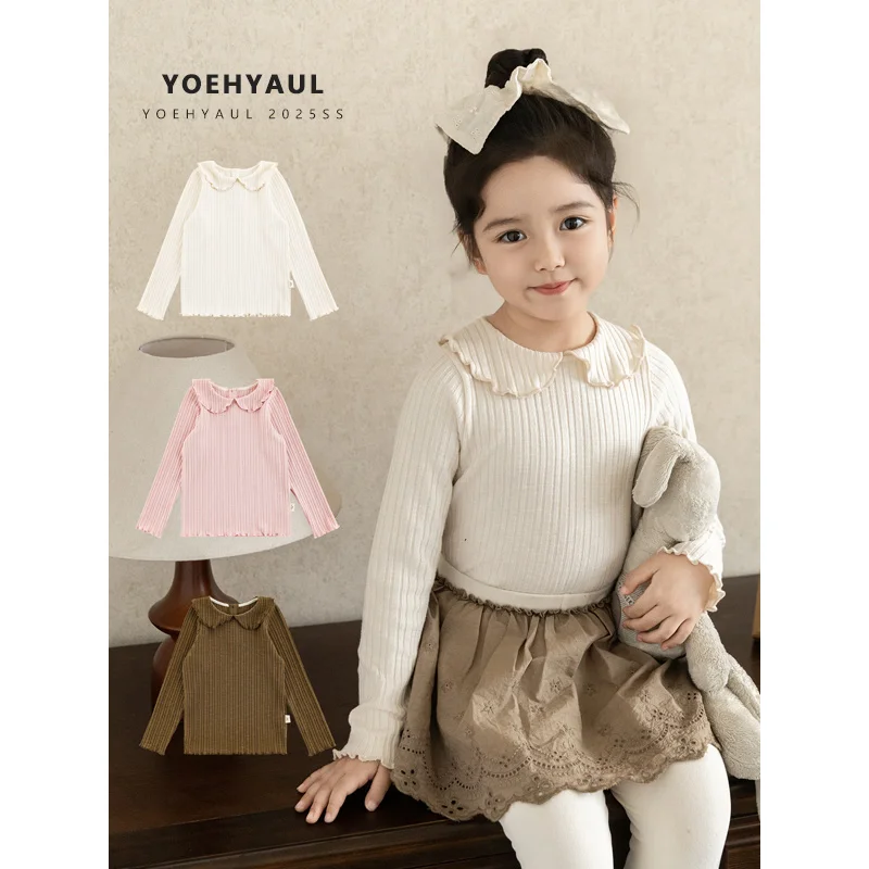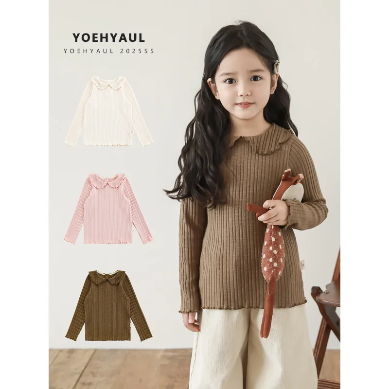 YOEHYAUL Q4597 Peter Pan Collar Solid Customized Kidsbaby Girl Shirt Long Sleeve Knit Customized Kids Tops for Kids Girls