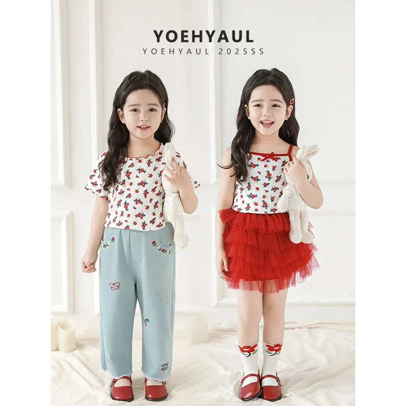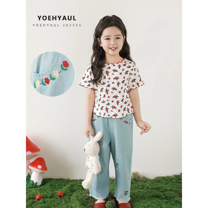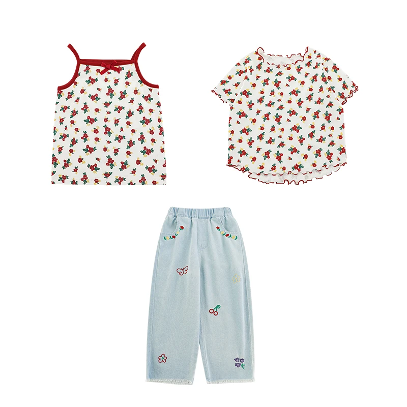 YOEHYAUL X4891 Floral Print Toddler Clothing Sets 3 Pieces Tank Top Jeans T Shirt Kids Outfit Sets Girls Summer Toddler Girl Set