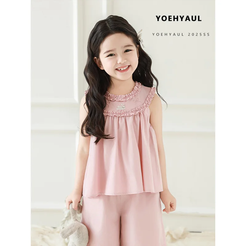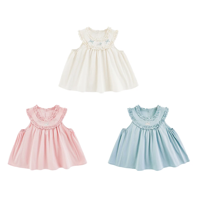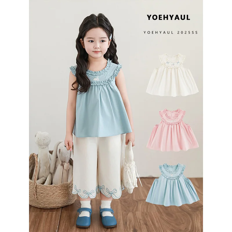 YOEHYAUL X5133 Embroidery Bunny Sweet Kids Blouses for Girls Children Summer Sleeveless Kids Cotton T-shirt with Ruffles