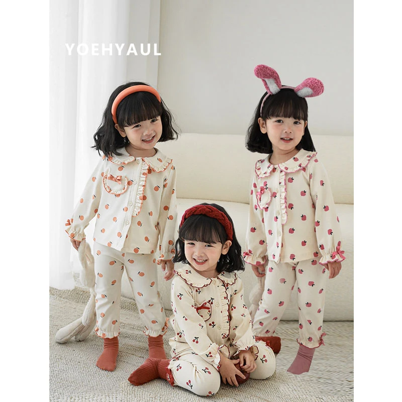 YOEHYAUL NO MOQ Spring Fall Soft Toddler Girls Kids Cotton Pajamas Sets With Ruffles Fruit Printed Loungewear Sleepwear for Kids