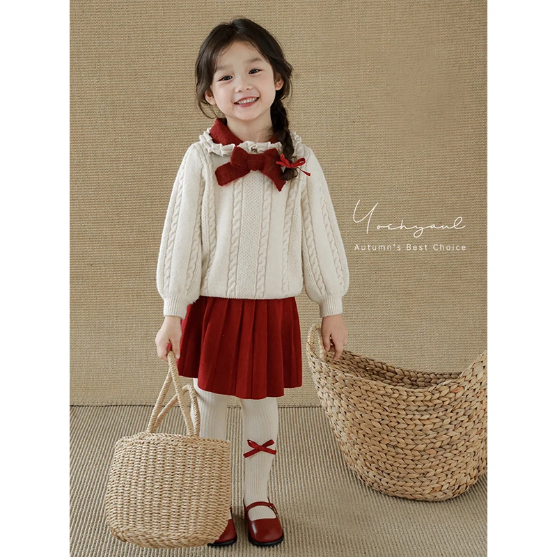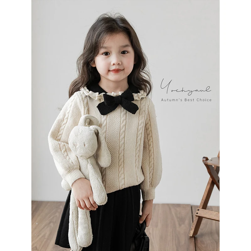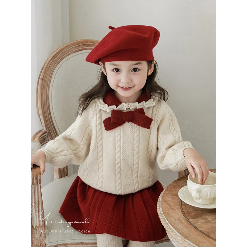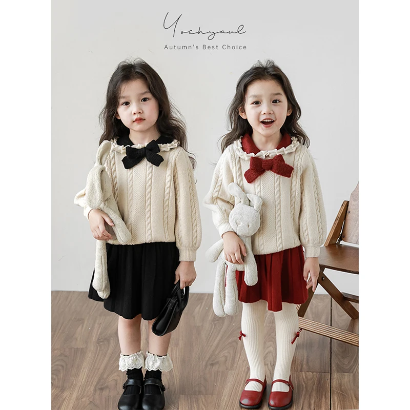 Girls' Spring Autumn Fashion Suit Children's Contrast Color Collar Bow Sweater and Pleated Skirt Casual Two-piece Set