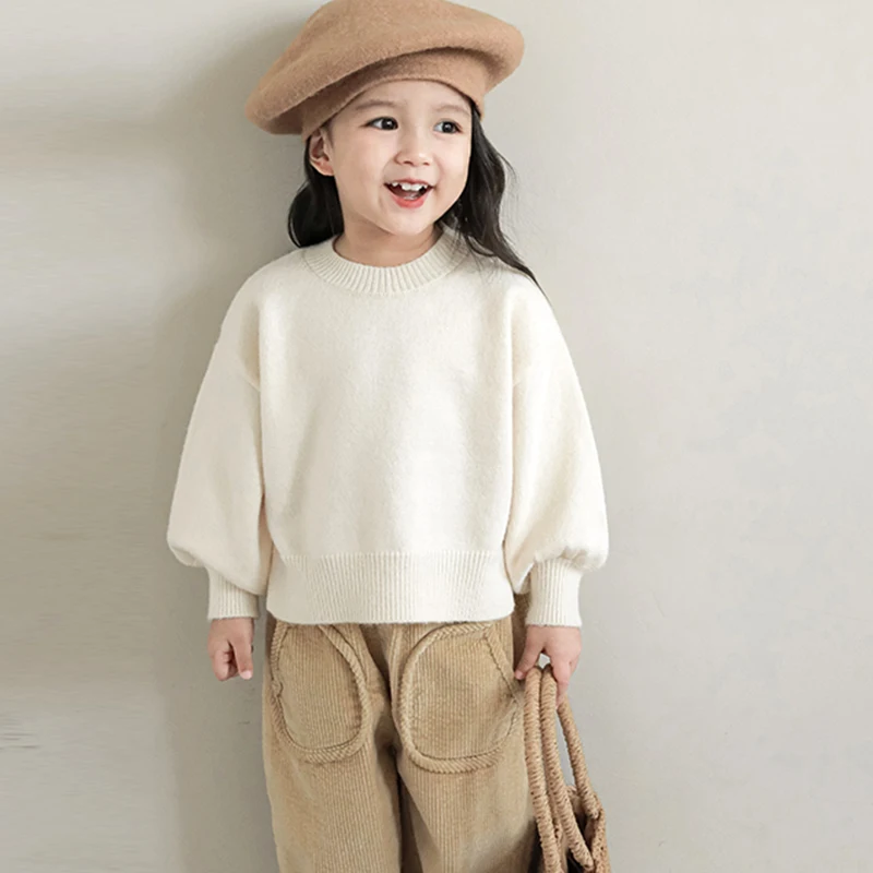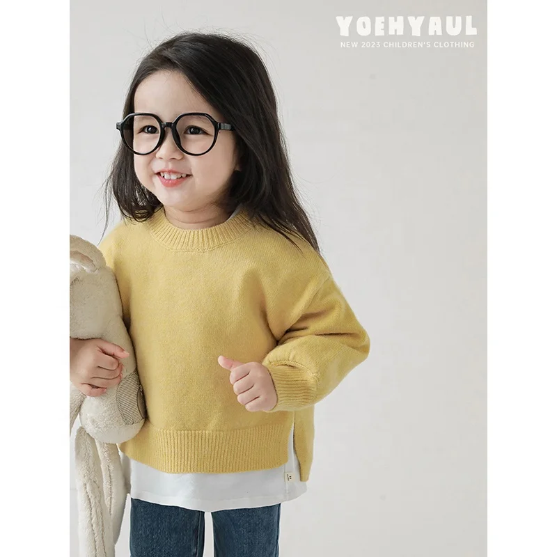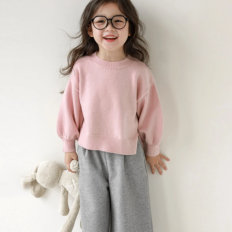 OEM / ODM Solid Color Loose Baby Girls Sweaters Child Little Girls Crew Neck Knitwear Custom Kids Knitted Sweater Top