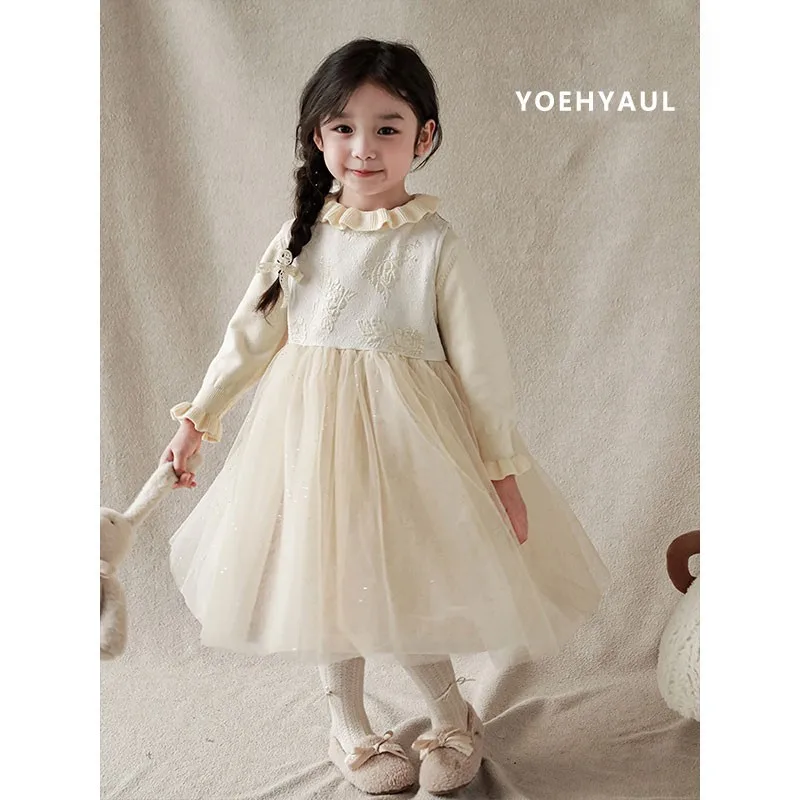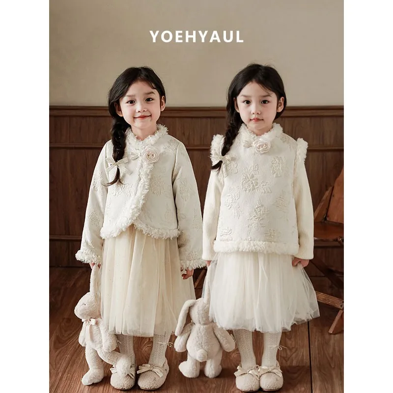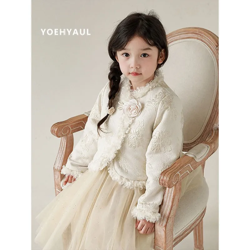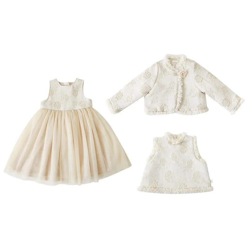 YOEHYAUL Girls' Winter Suit With Flower Branches and Woven Gold Jacquard Warm Jacket With Gold Mesh Dress Multi-Piece Set