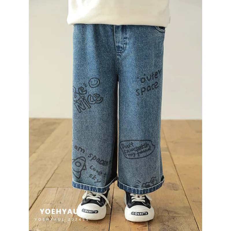 YOEHYAUL N5154 1-8 Years Elastic Waist BoyJeans Kids Children Casual Blue Toddler Boys Jeans Denim Pant for Kids Printed Jeans