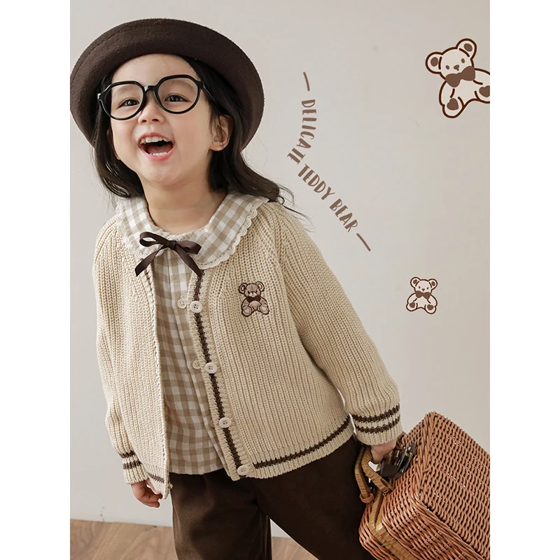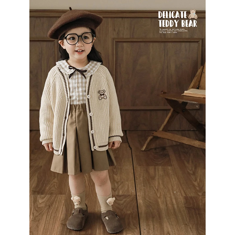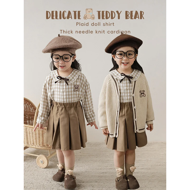 2023 New Girls' College Style Two-piece Plaid Children's Teddy Bear Cable Embroidered Logo College Shirt/Cardigan