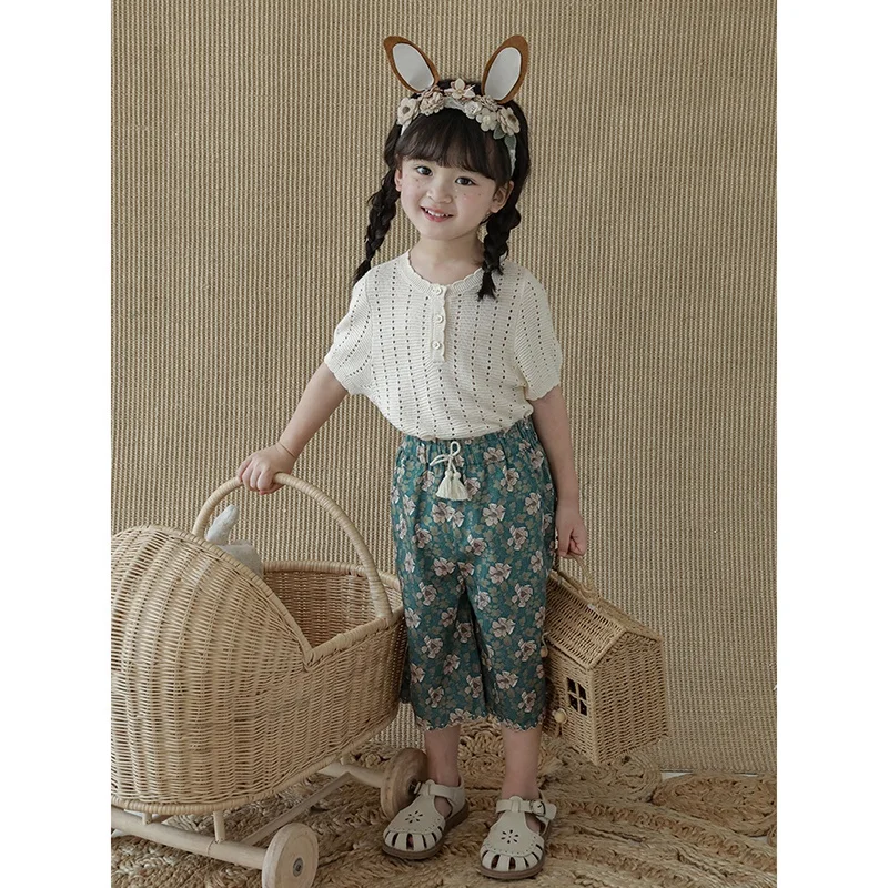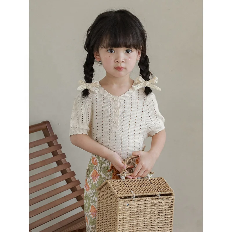 X4046 Hollow-out Beige T-shirt Summer Baby Girls Puff Sleeves High Quality Wholesale Pure Cotton Kids Girls Clothing