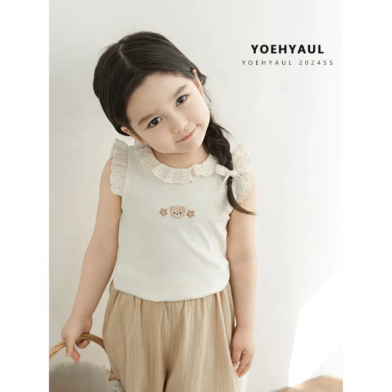 Girls Two Piece Outfit Customizable Cute T Shirt with 3D Bear Embroidery and Lace Trim Skirt Summer Apparel
