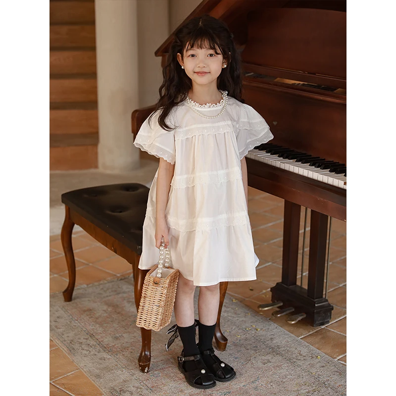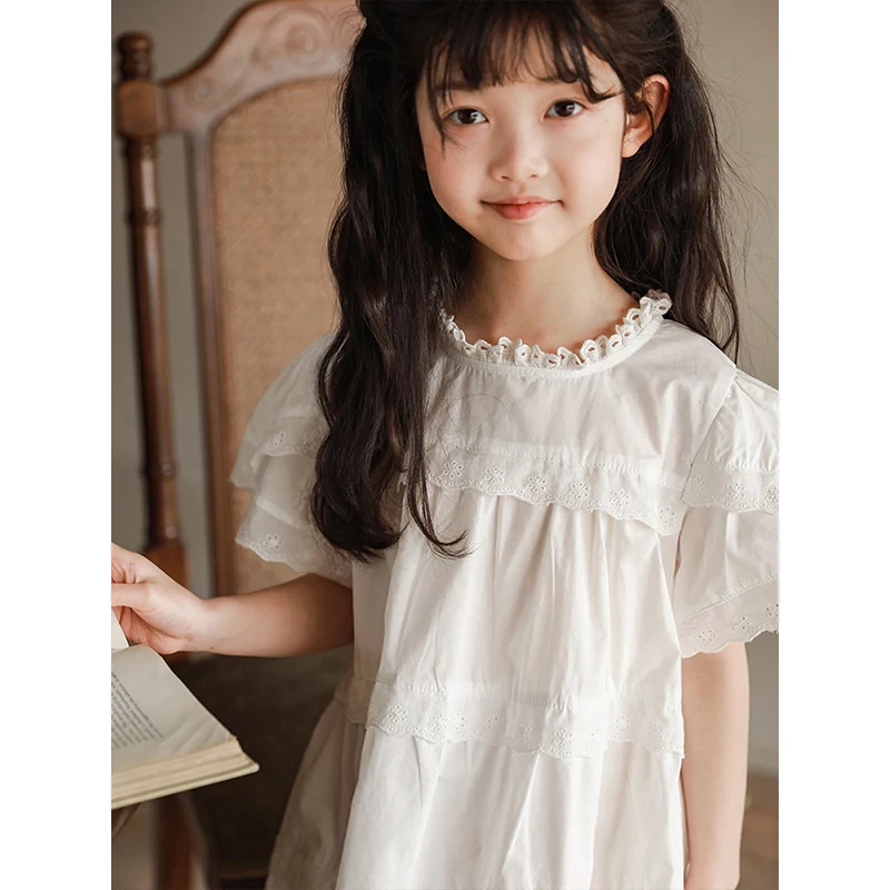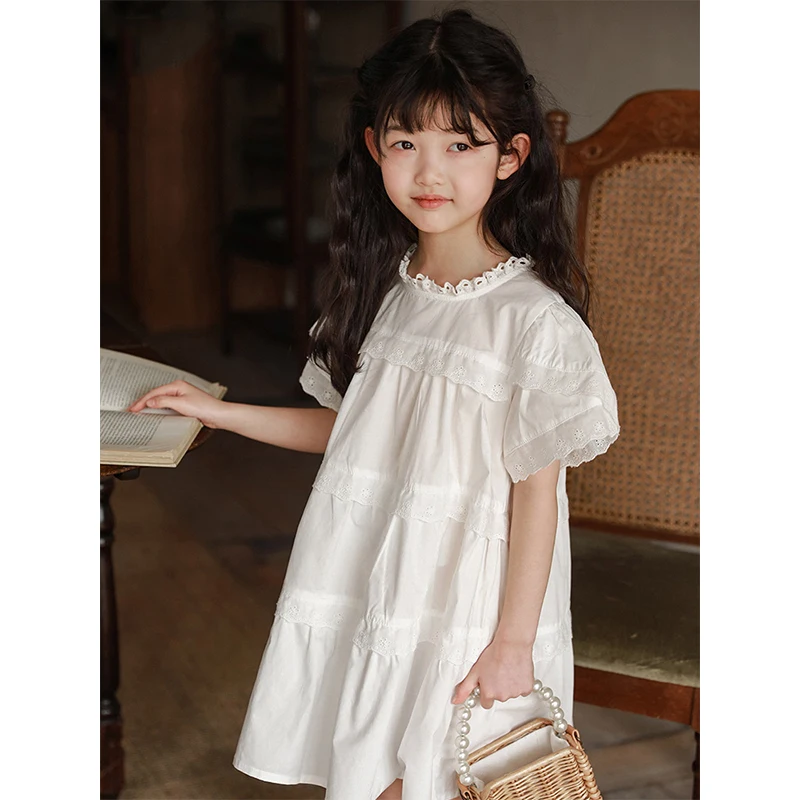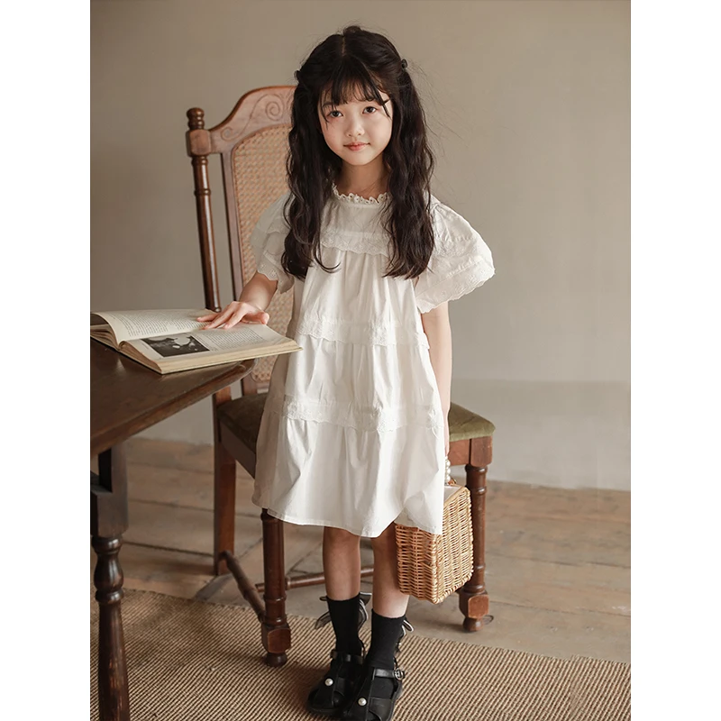 YOEHYAUL CD0356 Loose O-neck Cotton White Dress for Kids 2-10 Custom Logo Child Dress for Teen Girls