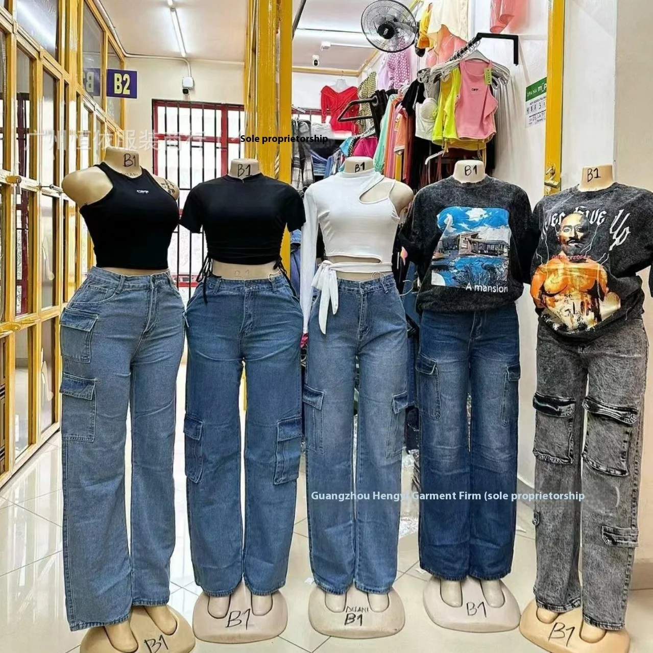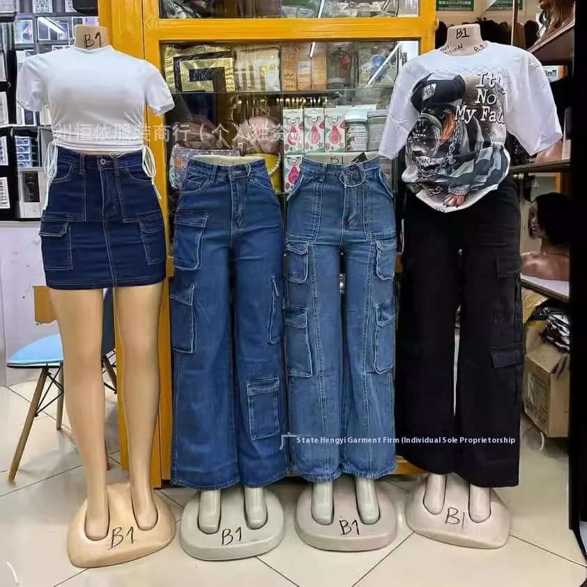 Women's High Street Style Mid Waist Summer Cargo Design Factory-Source Denim Overalls Multi-Pocket Freight Patchwork Straight