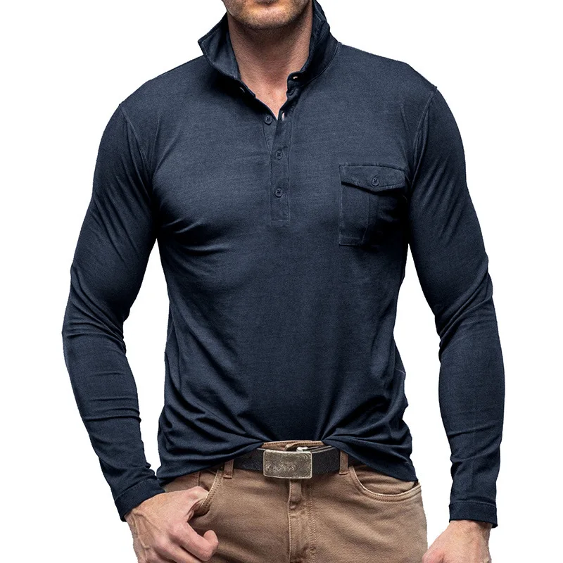 Henry Men's Long-Sleeved Polo Shirt Pocket Lapel Autumn Winter Outdoor Leisure Cross-Border Fashion Solid Foreign Trade Suit