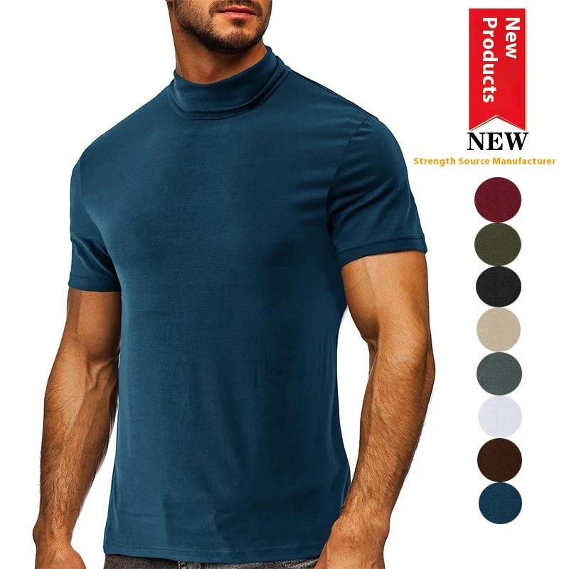 2026 Summer European Men's High-Neck Short-Sleeved T-Shirt Solid Design Wholesale Knitted Oversized T-Shirt