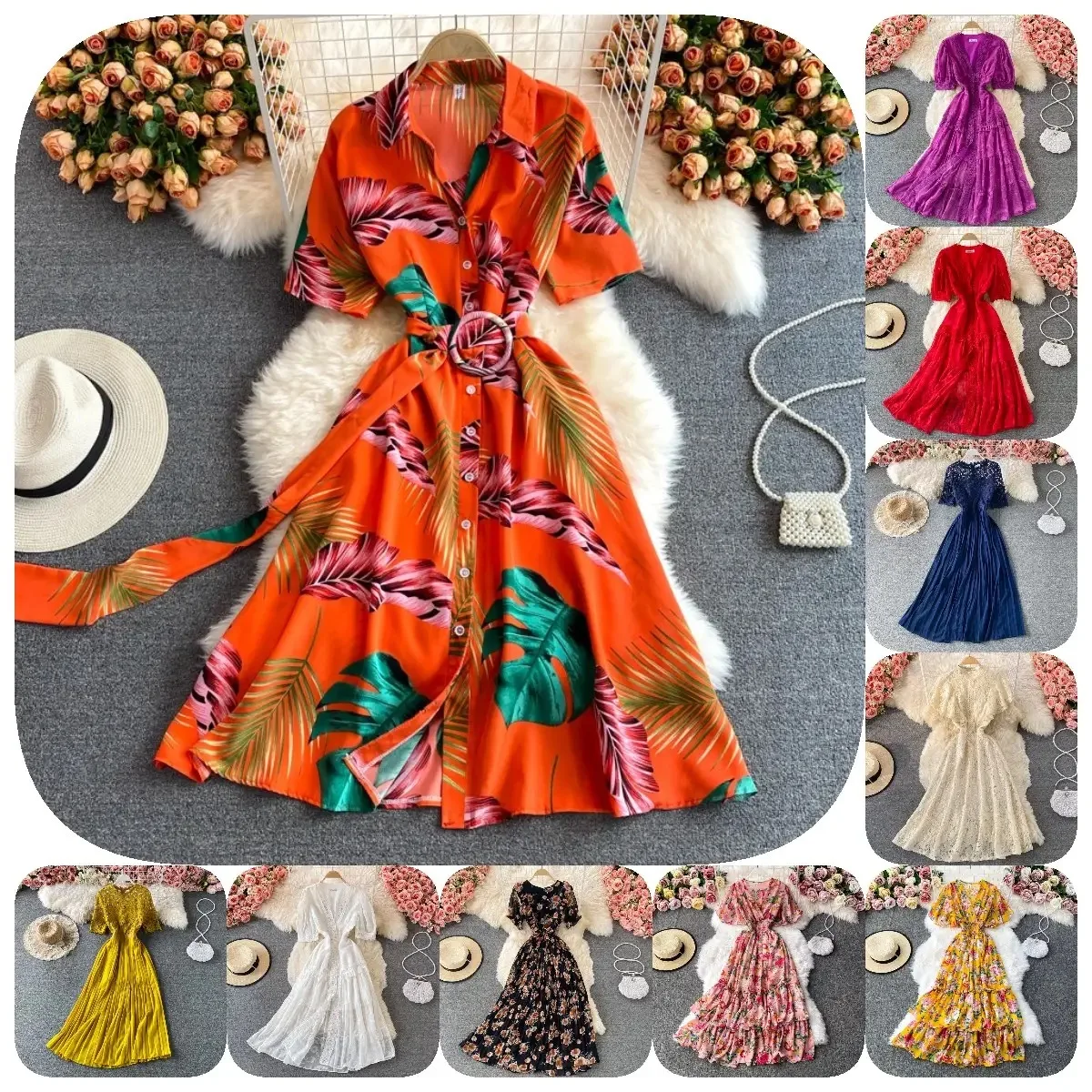 2026 Summer Collection Elegant Floral Print Chiffon Long Dress for Women Casual Mini Slash Neck Short Sleeve Spandex Bow Ruched