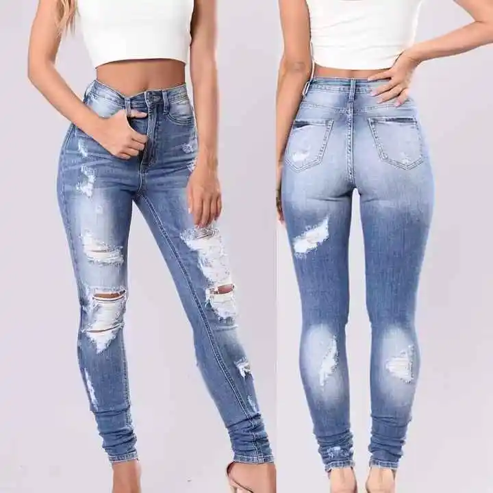 Women's High Waist Casual Style Denim Jeans Pencil Pants Solid Pattern Skinny Zipper Fly Ripped Decoration Breathable Light