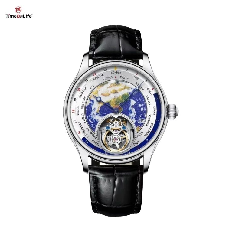 Factory Custom 42mm Earth Watches Luxury Classic Men's Casual Watch Stainless Steel Automatic Analog Tourbillon Leather Watch