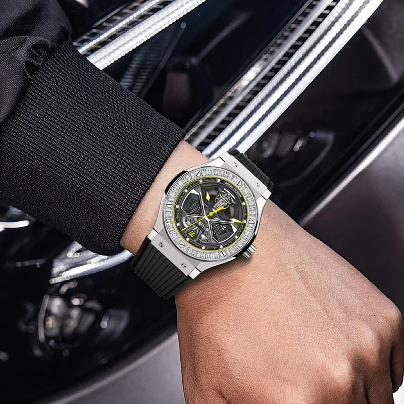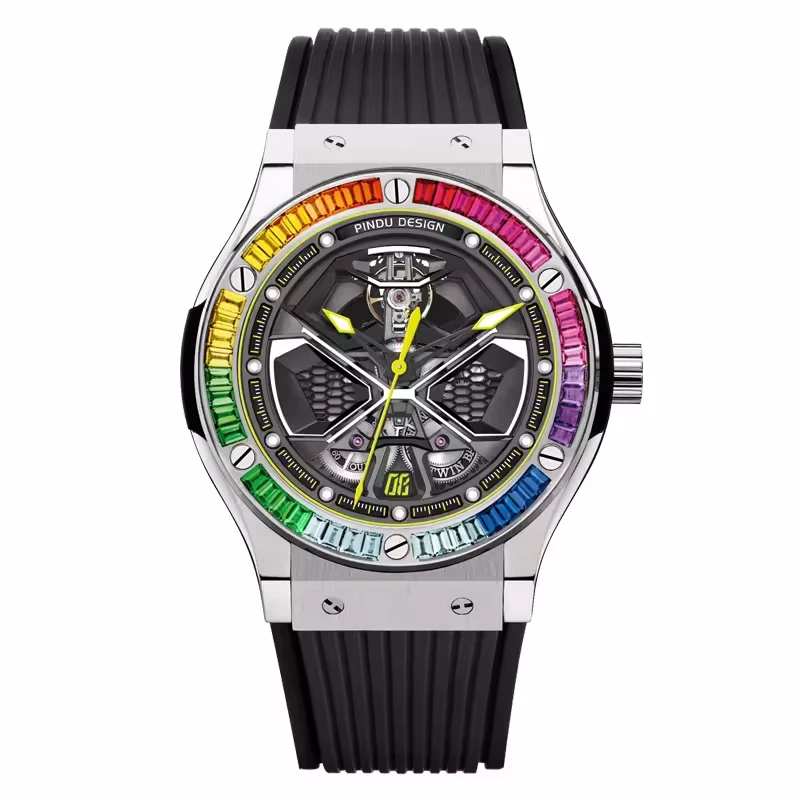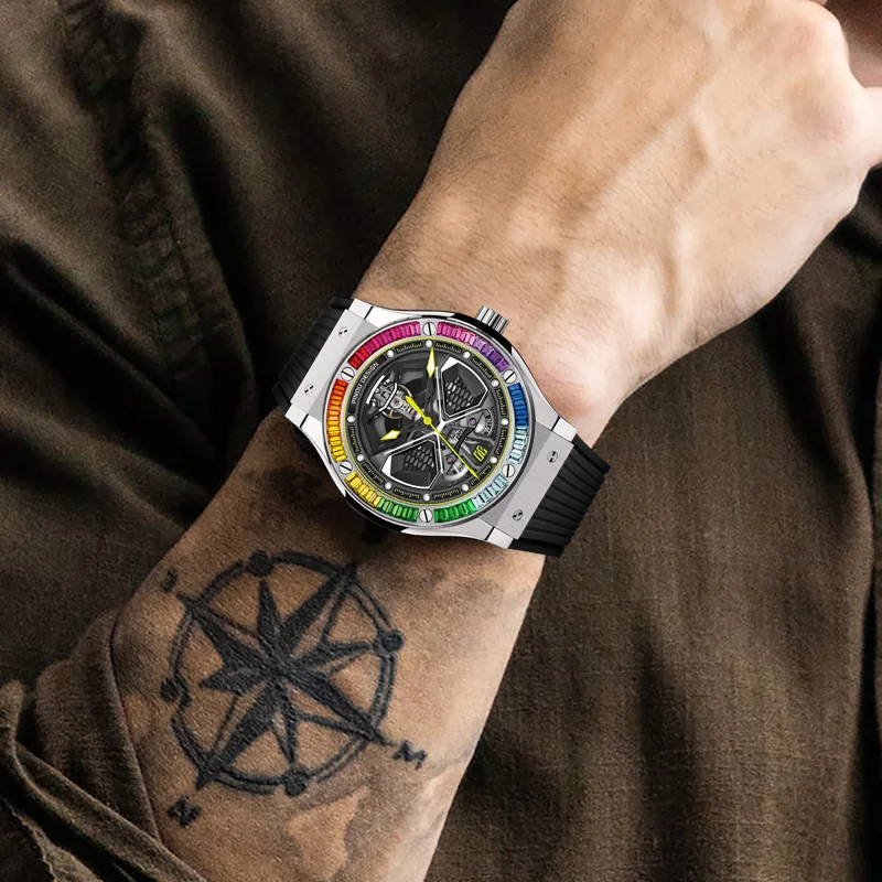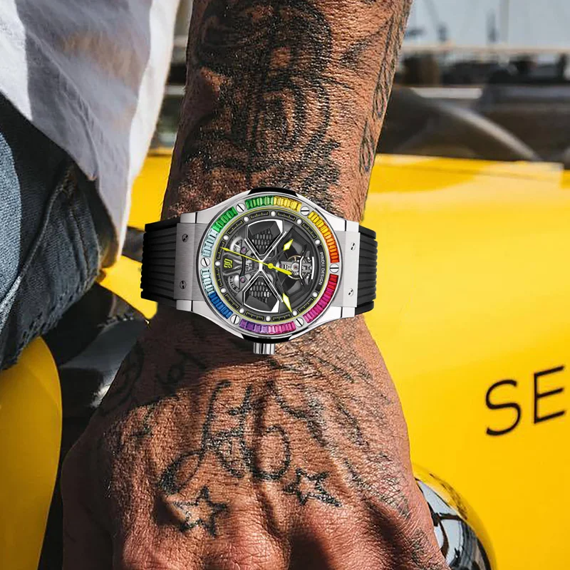 Factory Customized Logo Men's Watch Luxury Hollow Design Rainbow Bezel Watch Leather Silicone Strap Automatic Mechanical Watches