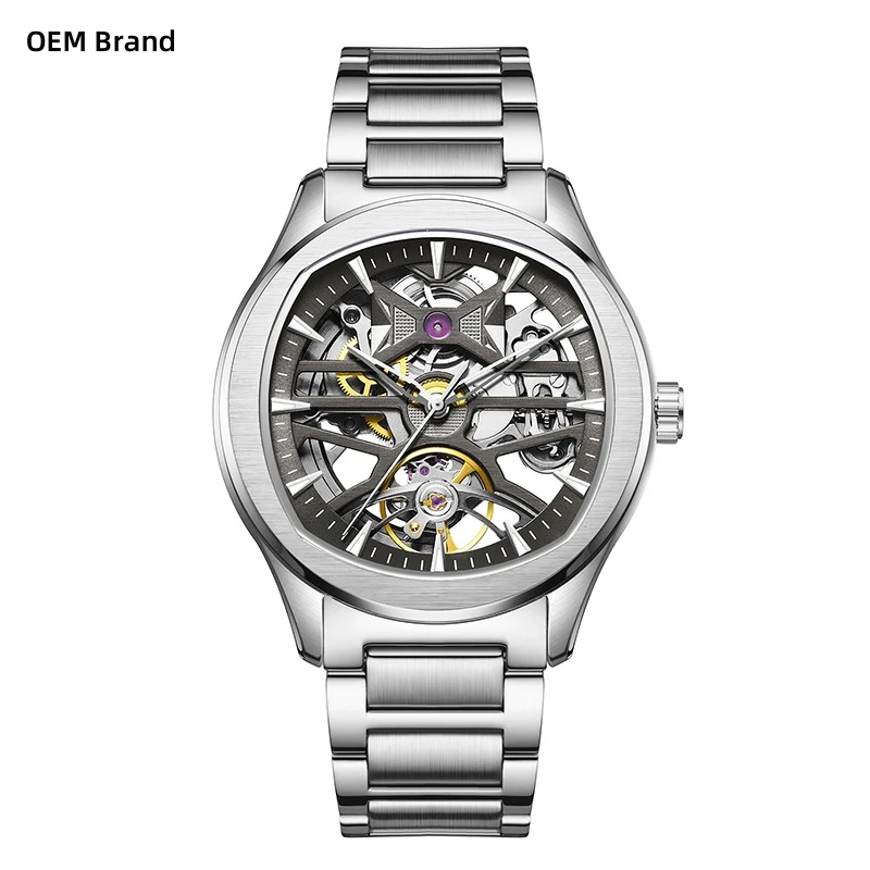Luxury Hollow Dial Stainless Steel Pointer Mechanical Men's Skeleton Watches with Silicone Strap OEM/ODM Custom Available