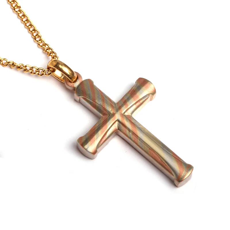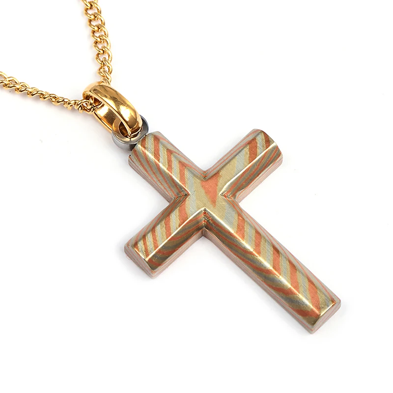 Hot Sale Mens Cross Pendent With Vintage Necklace Stainless Steel Bail and Chain Unique Pattern Mokume Gane Tizti Pendant Cross