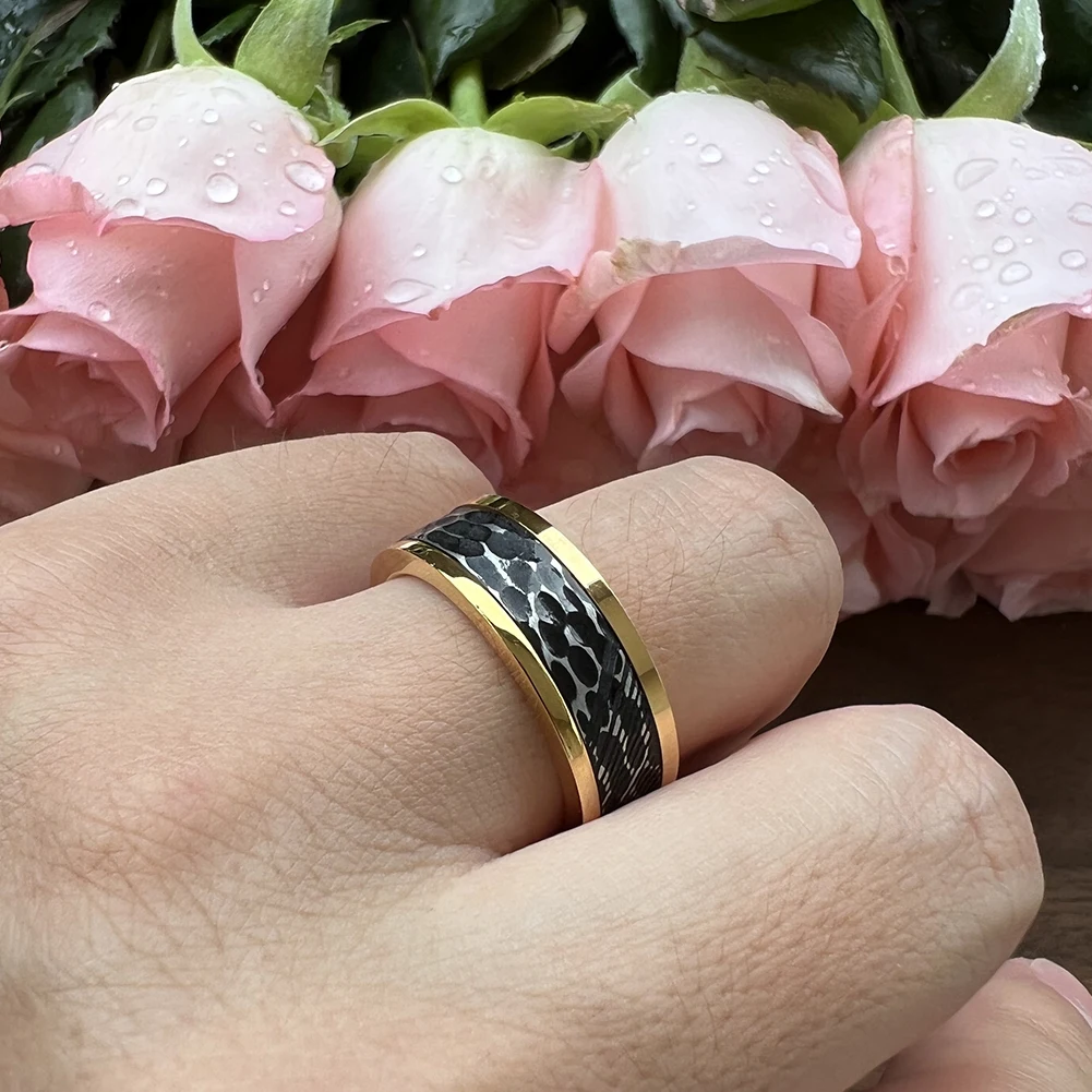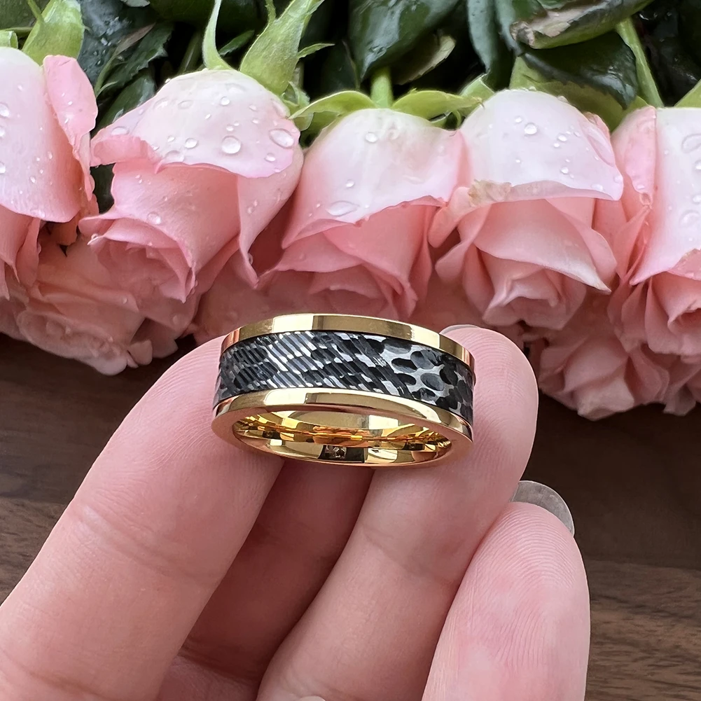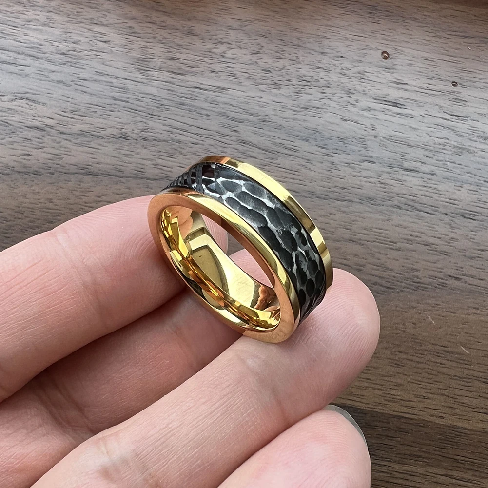 Tizti Jewelry 8mm Two Tone Custom Rings Black Hammered Brushed Inner Gold Stainless Steel Damascus Steel Wedding Rings