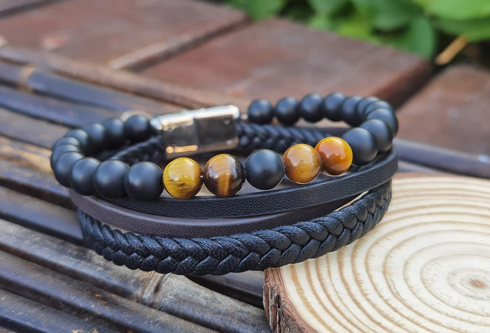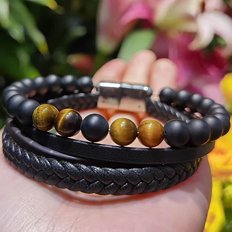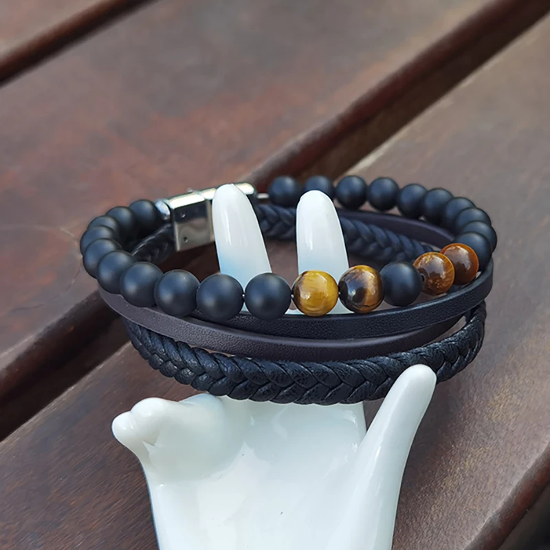 Men's Braided Leather Bracelet with Stainless Steel Clasp Tiger Eye Beads & Matt Box Onyx Adjustable Bracelet for Men