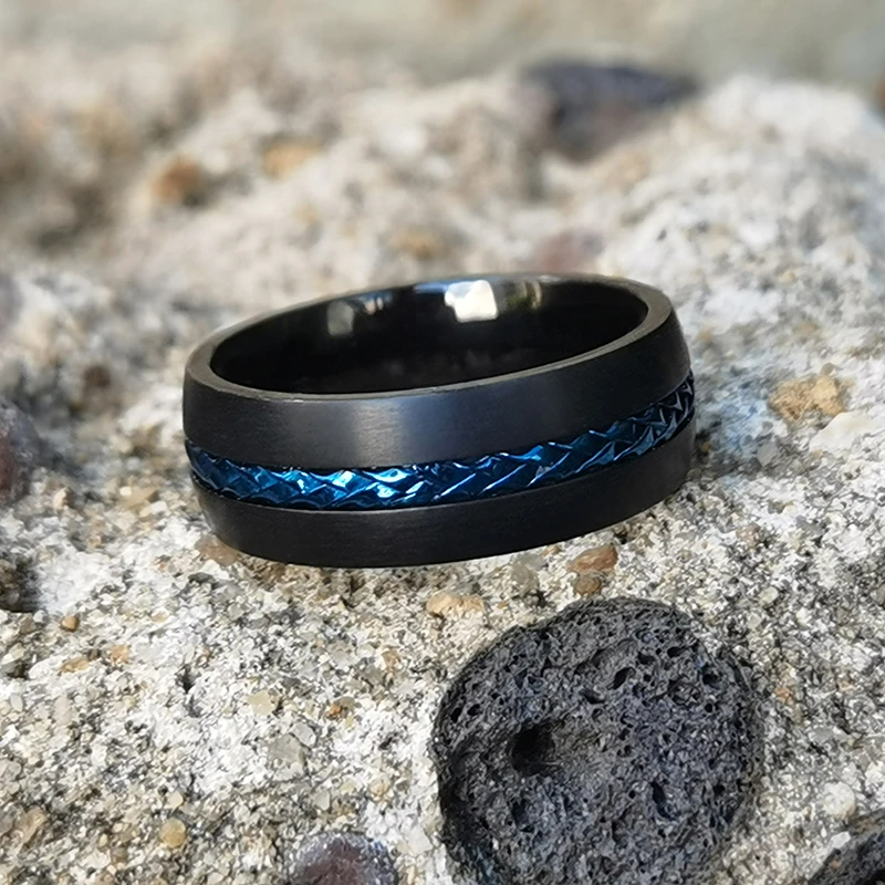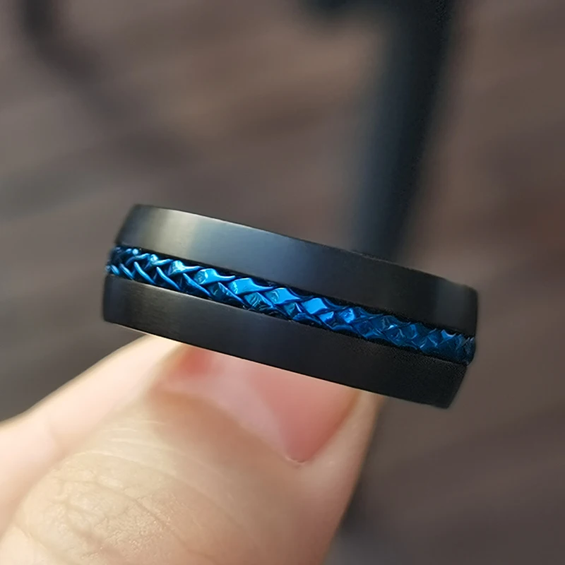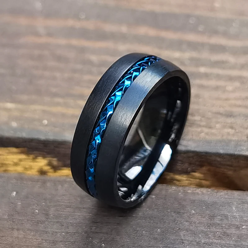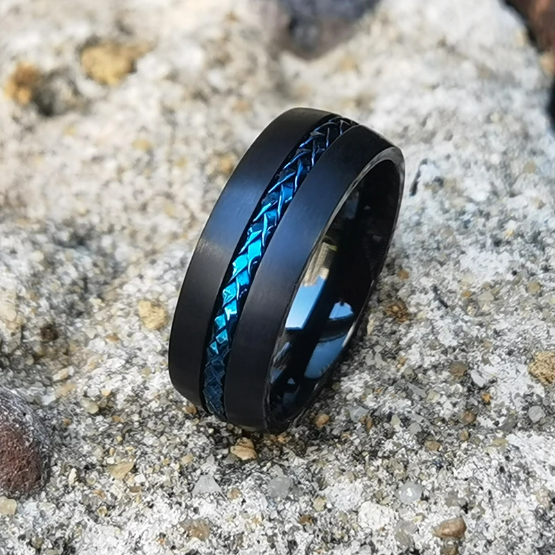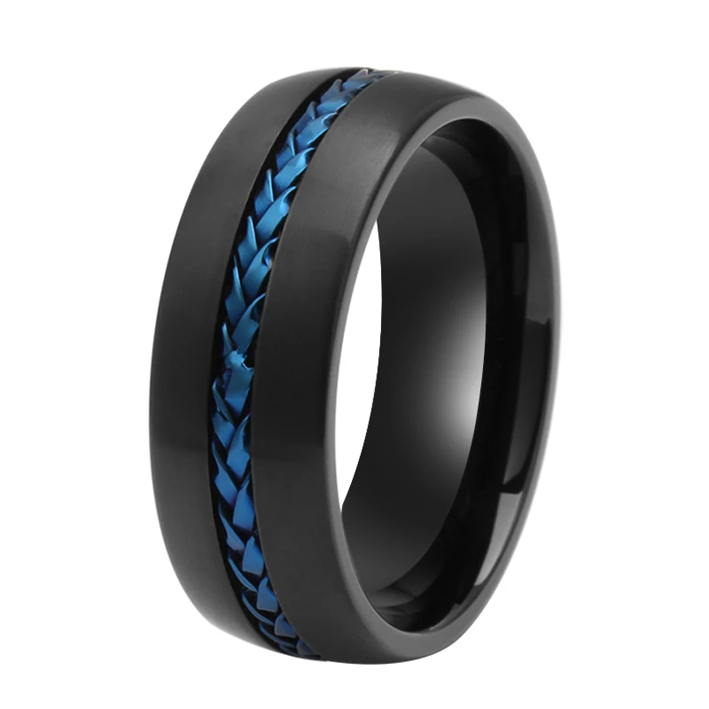 Classic Black Titanium Rings With Blue Steel Cable Inlay 8mm Comfort Fit Wedding Band