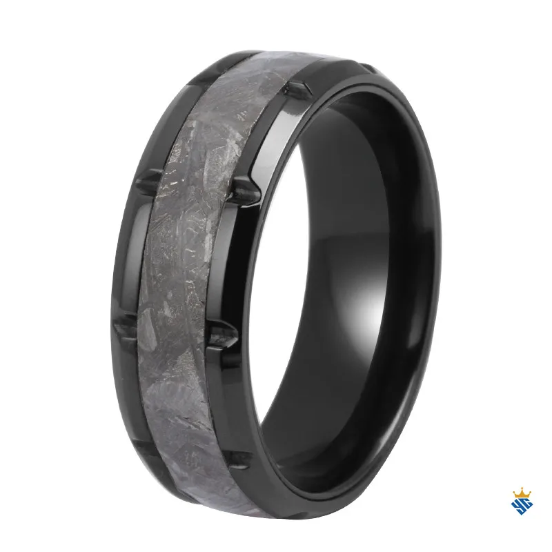 Gold Plated Strip Inlay 8mm Stainless Steel Insert Genuine Gibeon Meteorite Ring Black Zirconium Mens Wedding Bands