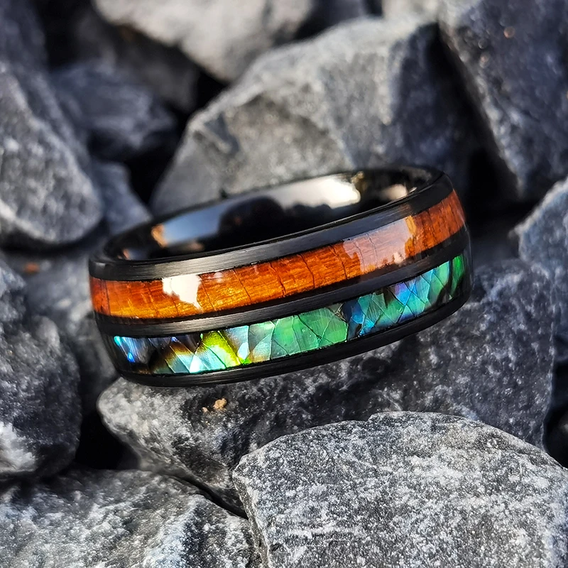 Fashion 8mm Black Tungsten Wedding Rings for Men High Polished Koa Wood Abalone Shell Ring Wholesale Alalone Shell Tungsten Ring